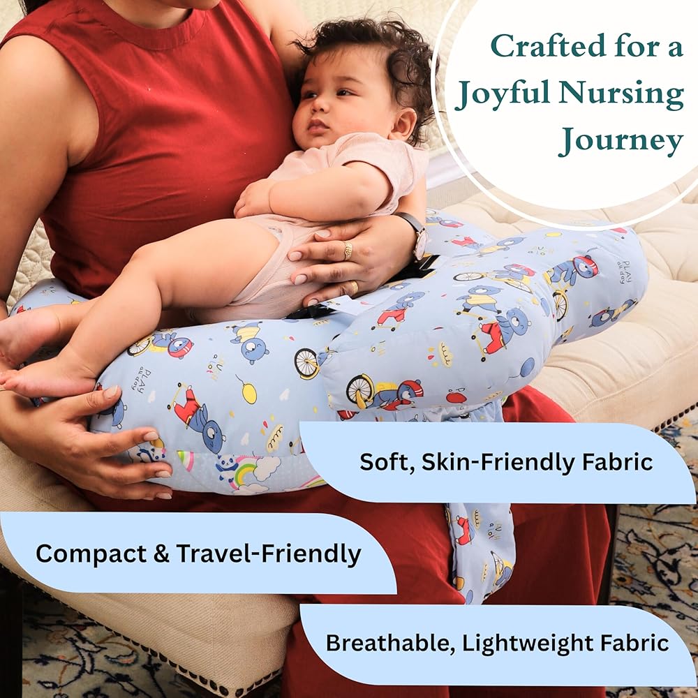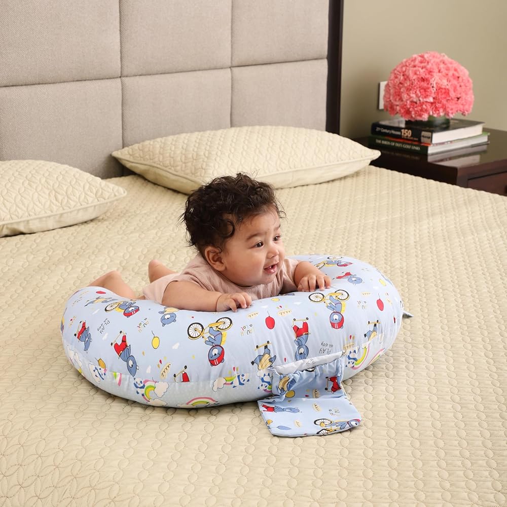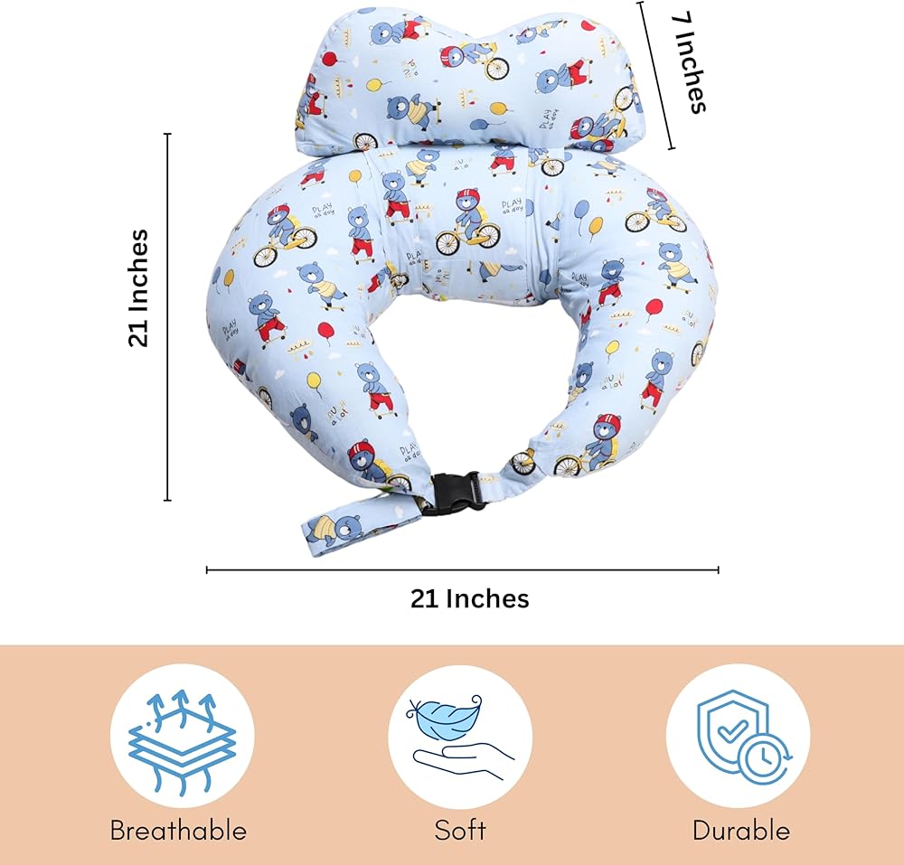 RELY+ Wheelybear Sky Blue Adjustable Nursing Pillow Detachable 100% Cotton Cover | Perfect Support with Plush Polyester Fill | Comfortable for Moms & Babies