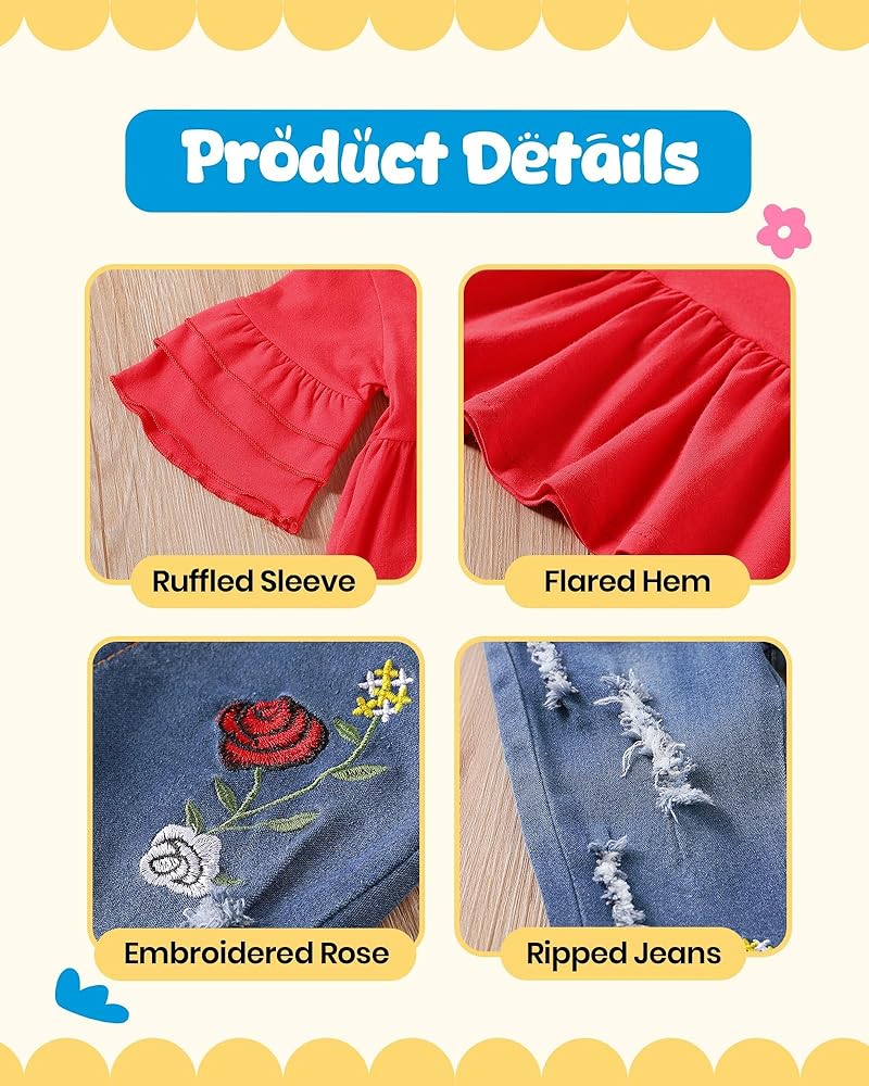 Welcome to NZRVAWS! Baby just like the angel in our family,we all want these angels to live happily and healthily.We pursue prevalent designs, and perfectness to produce elaborate clothes for our baby.Our vision is to provide the most comfortable and safe clothes for our babies,let parents to dress up their angel babies become more lovely and fashion. This set is our new product, classic ruffle top matches elastic waistband pants, let your little girl looks beautiful and fashion.Your girl must be very happy if they receive the set of clothes as birthday gift! 1.Baby Girl Clothes Multiple Size Options:toddler infant girl set fit for 6-12 months baby girl clothes,12-18 month baby girl outfit ,18-24 months infant girl clothes,2-3T toddler girl clothes, 3-4T toddler girl clothing. 2.Baby Girl Outfit Set Includes:1*ruffle top + 32*long jean pants.
