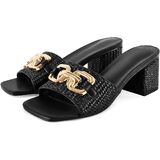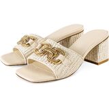 These stunning raffia sandals feature an open design with a distinctive square toe. A striking gold chain embellishment adorns the upper, lending a luxurious touch to the casual-chic design