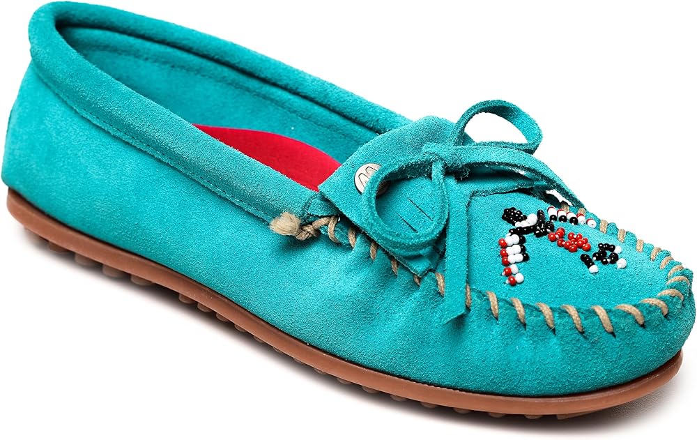This shoe collection pays homage to Lucie's Anishinaabe heritage and her son, Animikii - whose name translates to "Thunderbird" in Ojibwemowin. LOAFERS FOR WOMEN: Cute, comfortable loafer shoes for casual or dressy outfits. MOCCASIN SLIPPERS: These leather slippers can be worn as an indoor outdoor house shoe. QUALITY MATTERS: Featuring Native designed hand-beading, these statement moccasins look just as good as they feel with a soft suede or smooth leather upper and a padded insole.