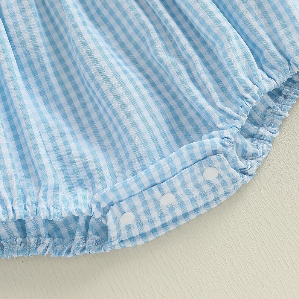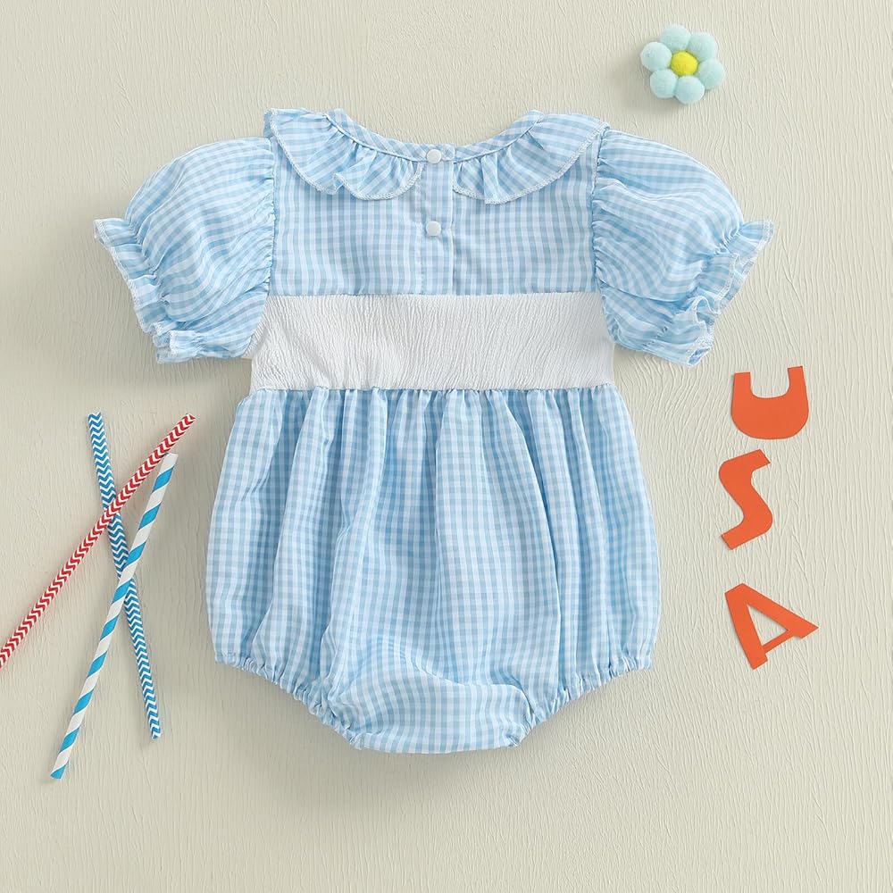 Design: Baby girl sweet romper; Short sleeve ruffle collar bows cowgirl boot embroidery smocked bubble romper; Snap closure at the crotch; Gingham smocked bubbles, gingham baby girl romper