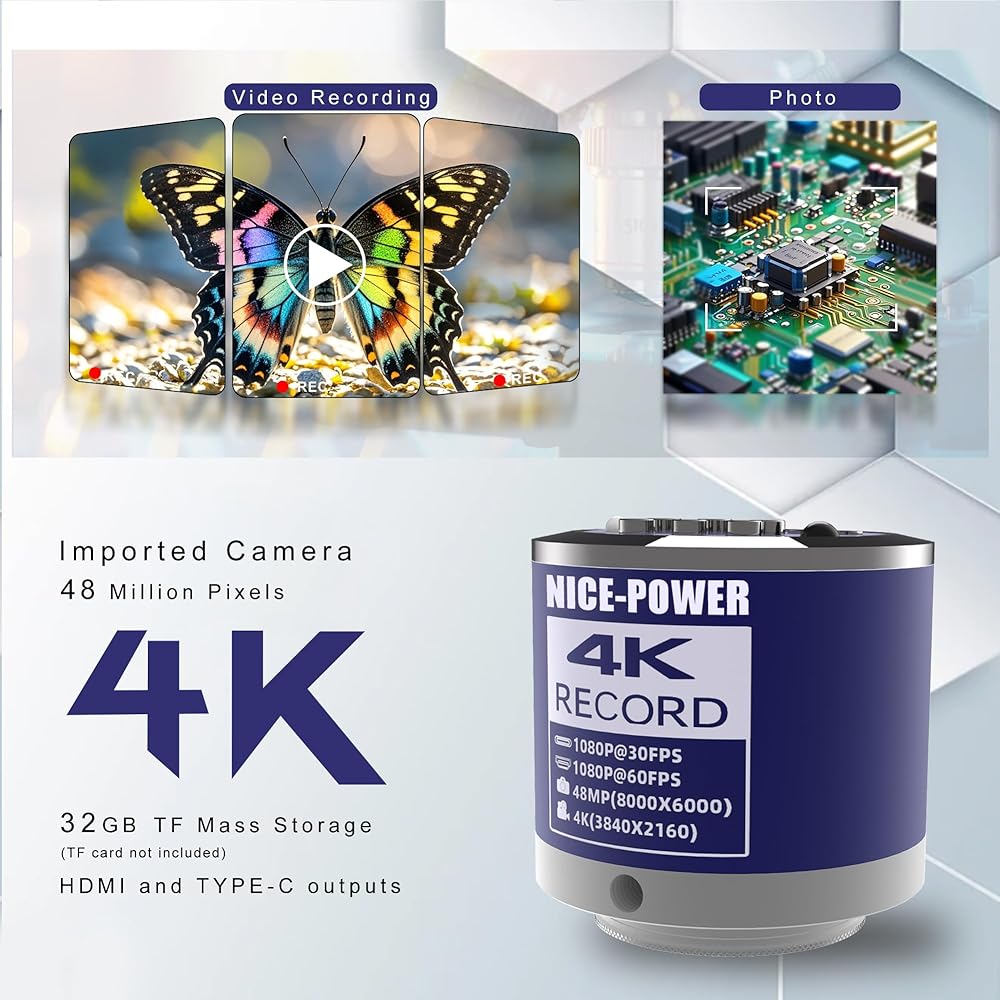 48MP 4K 1080P Microscope Camera: The camera of digital microscope adopts imported sensor. The industrial microscope can output 1080P HD image through HDMI and Type-C. The video microscope supports 4K video recording and can reach 48MP (8000*6000) pixels when taking pictures. The digital microscope camera supports up to 64G TF card storage.
