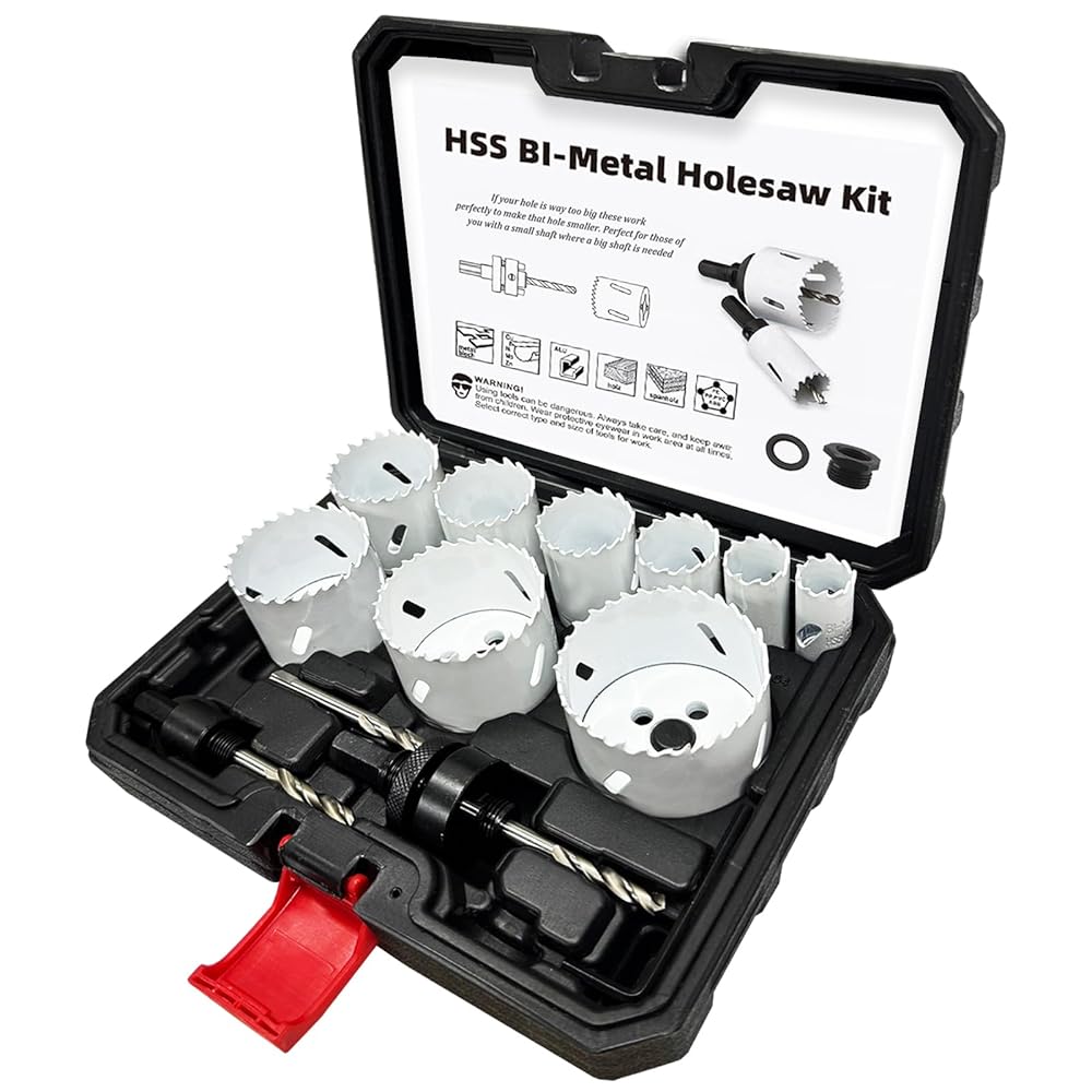 Size: The hole saw set includes a compact storage box with 9 saw blades: 3/4" (19mm), 7/8" (22mm), 1-1/8" (29mm), 1-3/8" (35mm), 1-1/2" (38mm), 1-3/4" (44mm), 2" (51mm), 2-1/4" (57mm), 2-1/2" (64mm), 1 7/16" hex arbor, 1 1/4" hex arbor, 3 HSS pilot bits, 1 arbor adapter.
