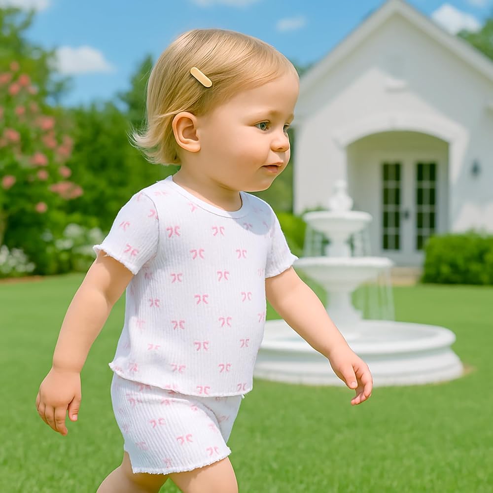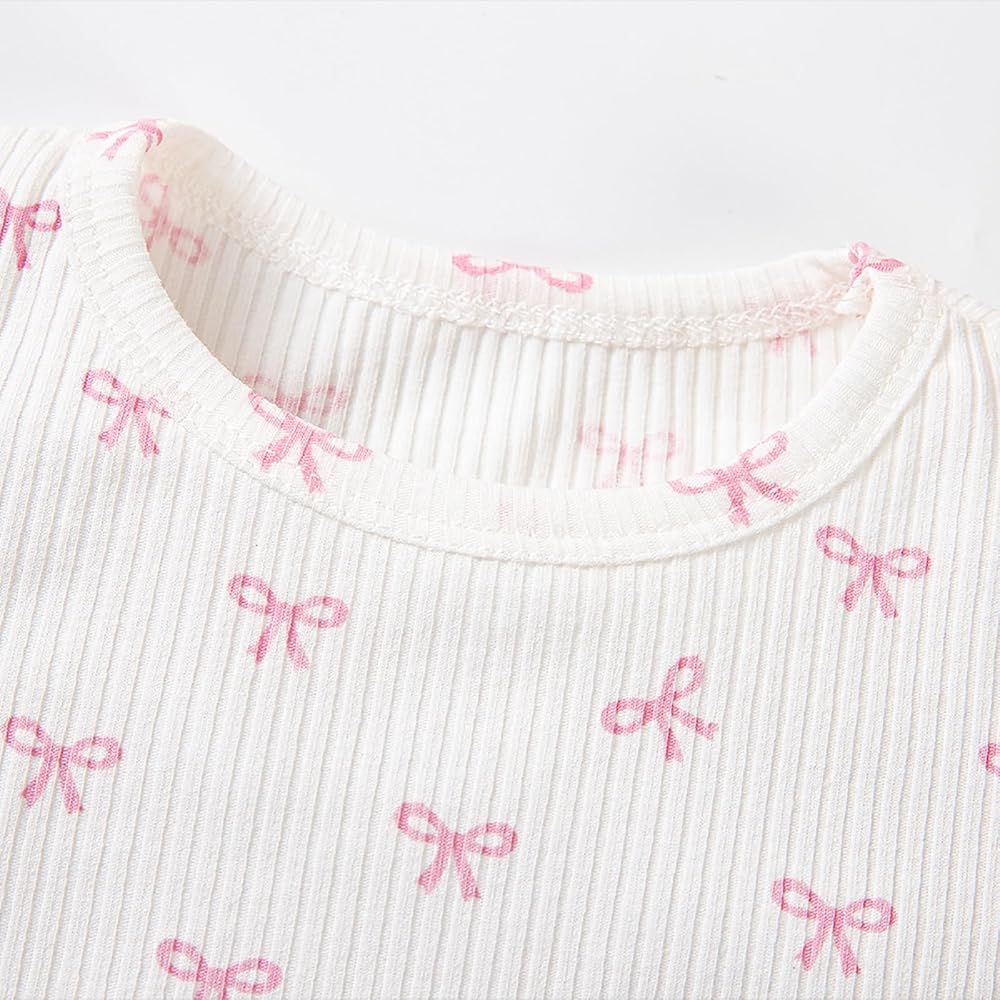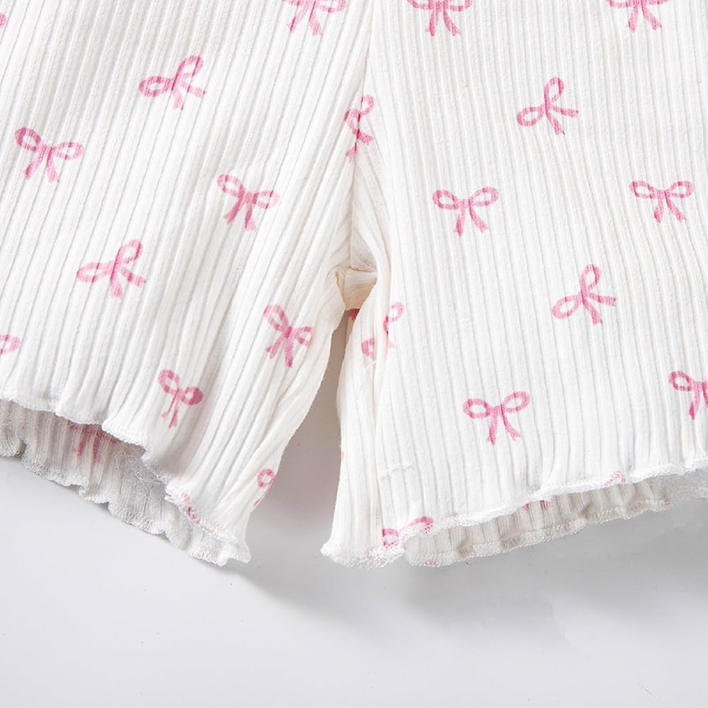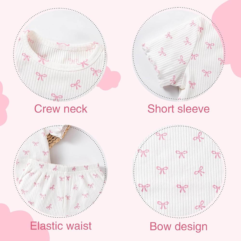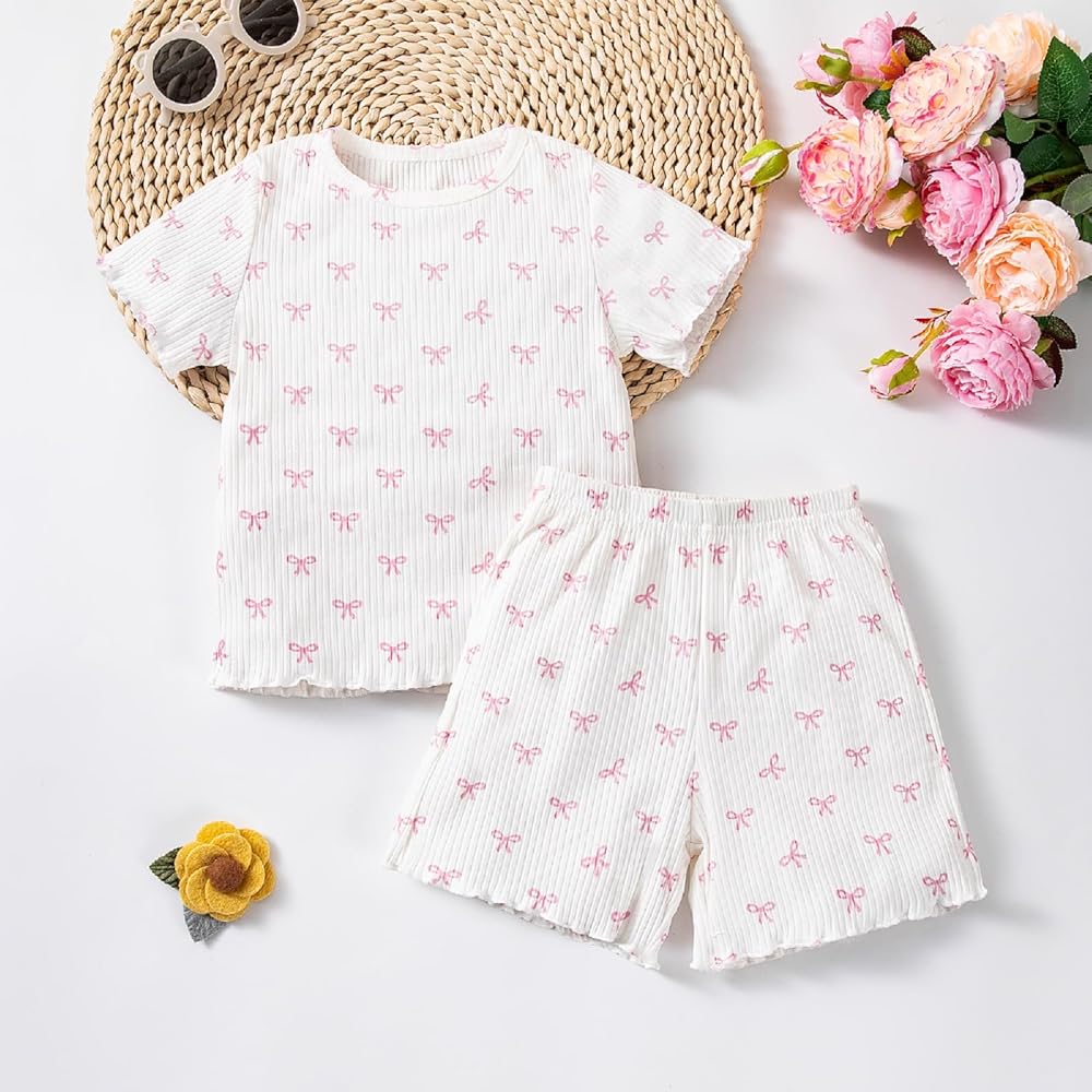 Cute Design: Toddler girl two piece outfits, including a lettuce trim crew neck short sleeve t-shirt and a lettuce trim elastic waist shorts, both with all over bow pattern for a chic and cute look.