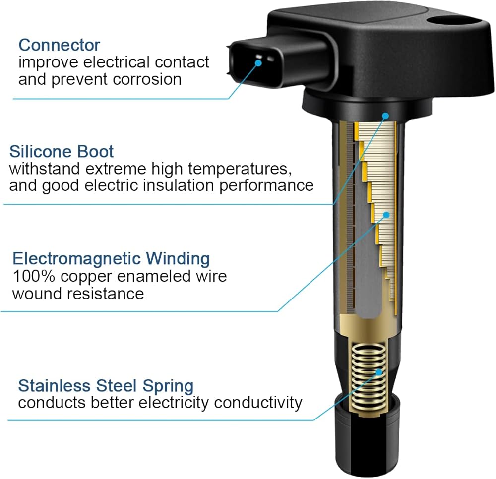 【Direct Replacement】--Over your original stock coils. We only use the highest grade materials. This makes our product durable and reliable under extreme conditions while providing High Electrical Resistance, strong Spark from plugs, and being resistant to Corrosion and Abrasion