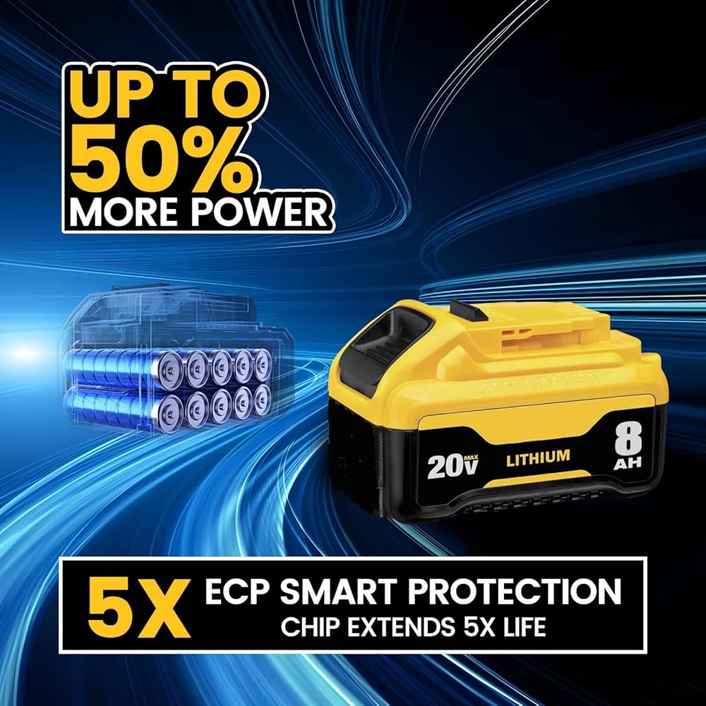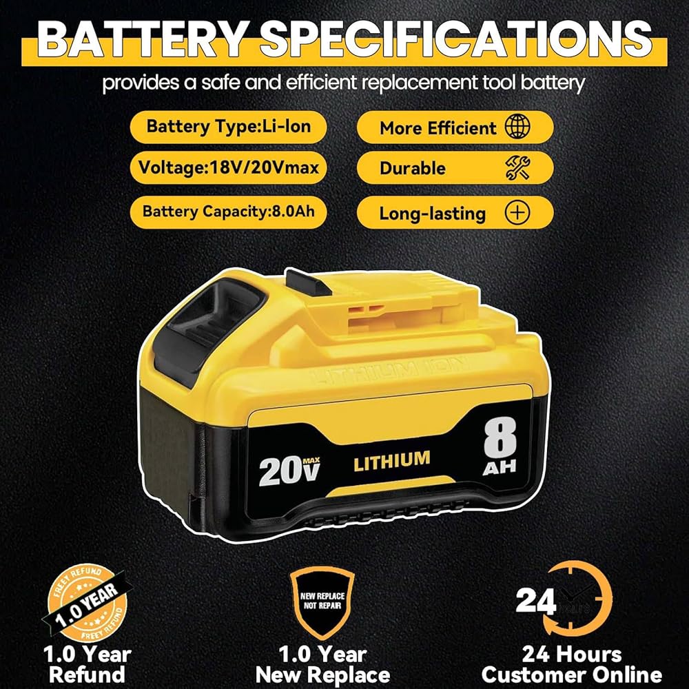【Battery Specification】Capacity: 8.0Ah | Battery type:Lithium ion | Package:2Packs | Voltage:20 Volt Max | Compatible with a range of 20V DCD/DCF/DCG/DCS series tools and DCB102/DCB107/DCB115/DCB118 ect chargers.