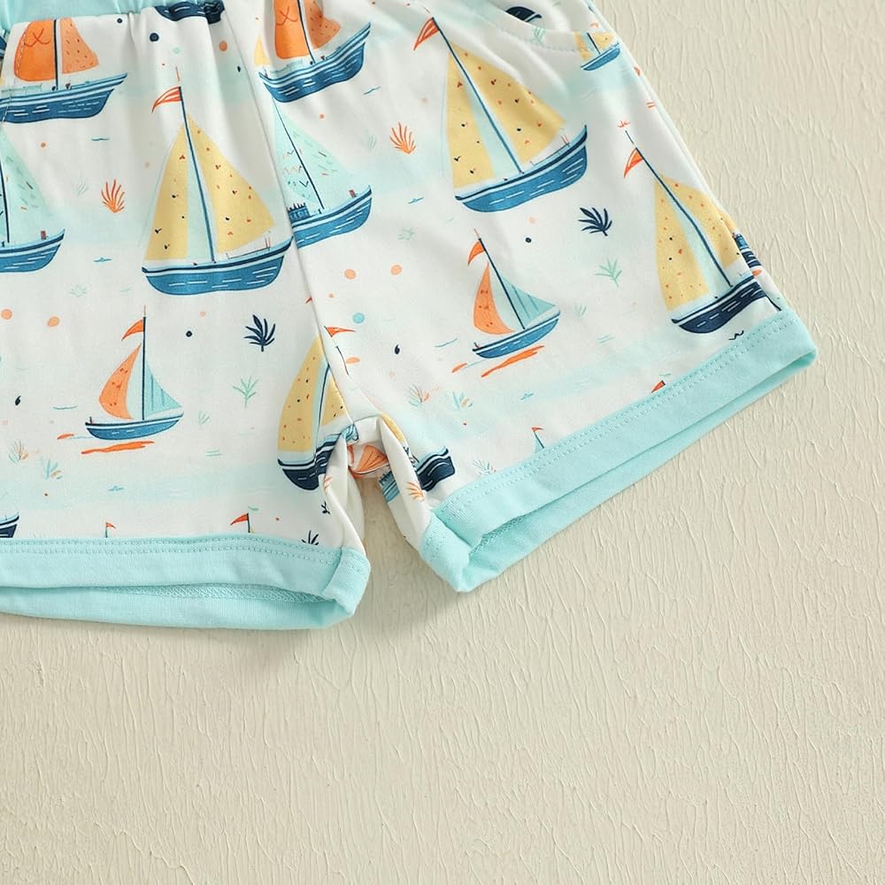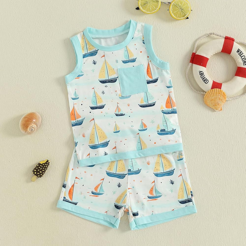 Summer Baby Boy Clothes Toddler Summer Outfits Sleeveless Sailboat Print Tank Tops + Pocket Shorts Set Baby Boy Beach Clothes