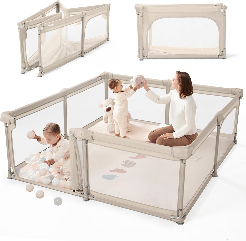 Sweeby Baby Playpen, 59x59 Inch Foldable Playpens for Babies and Toddlers with Gate, Large Playpen with Door Play Yard for Baby Fence Indoor and Outdoor Portable Play Pen, Beige