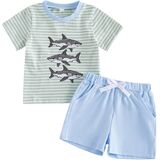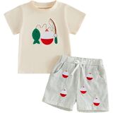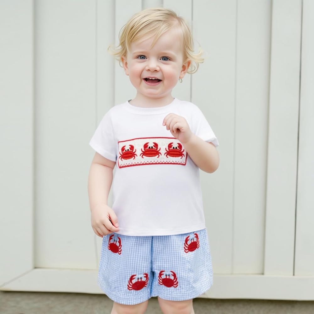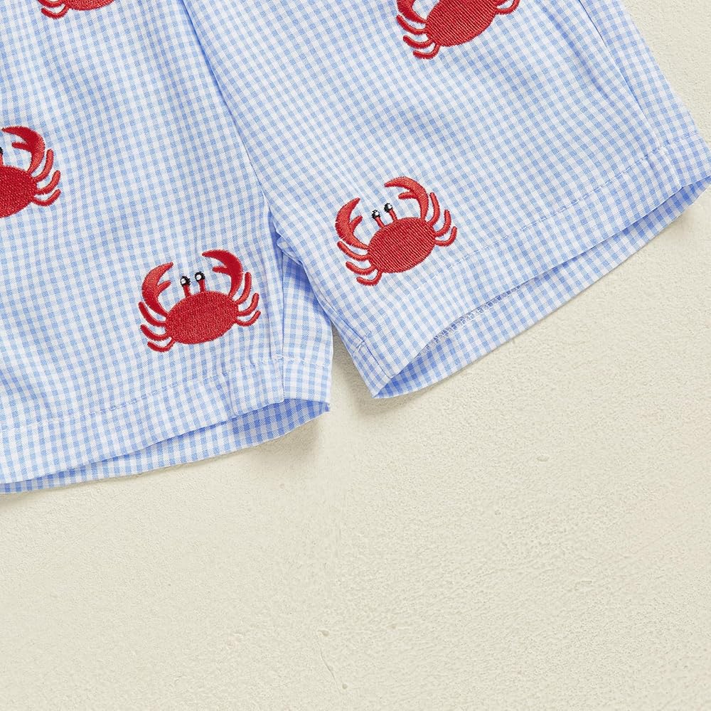 Toddler Little Boy Shorts Set Seafood Embroidered Short Sleeve T-shirts Plaid Elastic Waist Shorts Summer Clothes