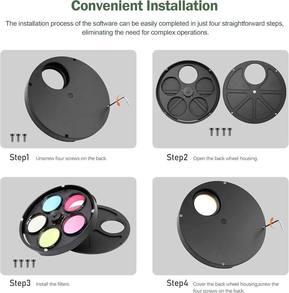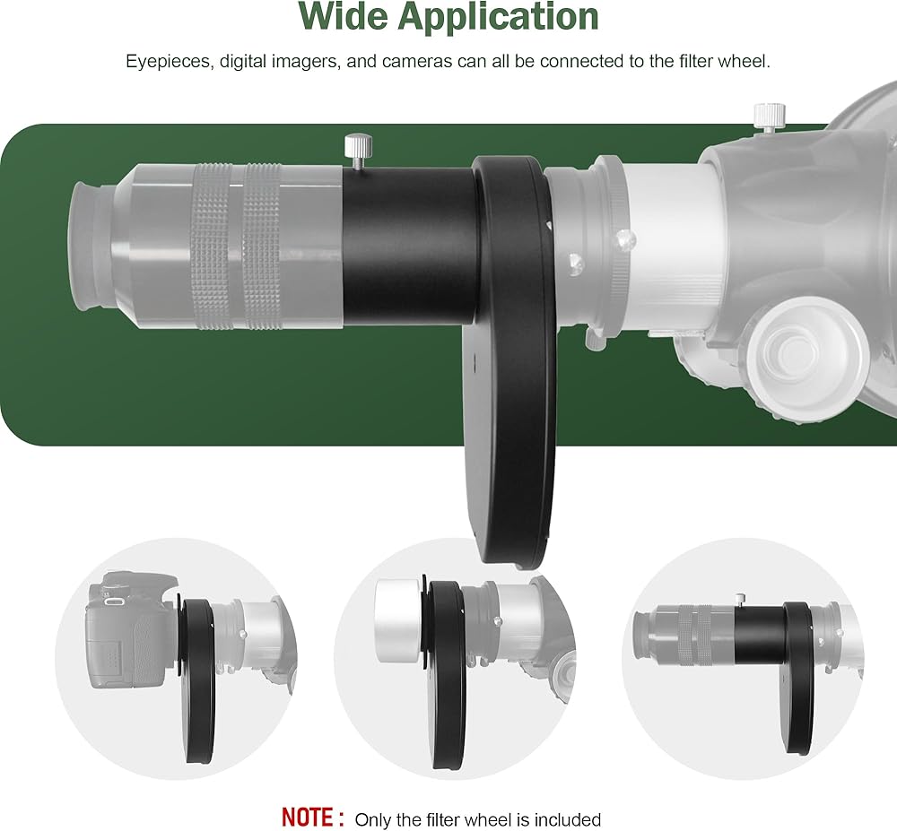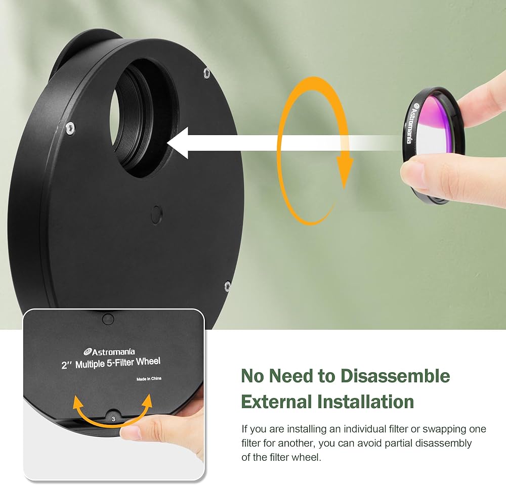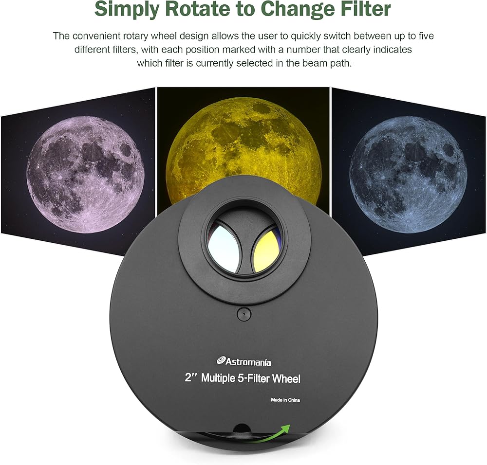 This 2 inch filter wheel lets you use up to 5 different filters and change them within just a few seconds; you can also leave your filters mounted in the filter wheel; as they are optimally protected from dust and damage there