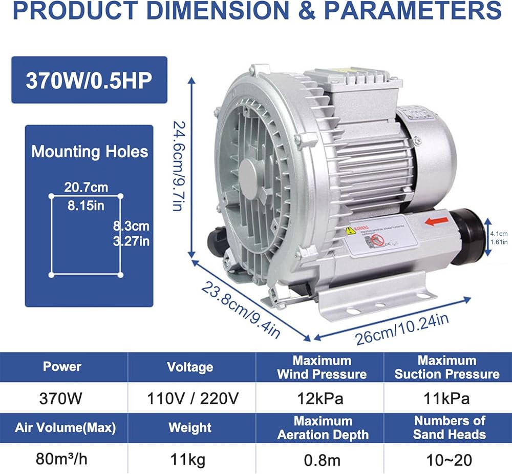 • 【Wide Application】: Regenerative blowers are suitable for industrial air blowing, textile industry, construction sites, fish pond aeration, hotels, aquaculture, printing and paper industries, etc