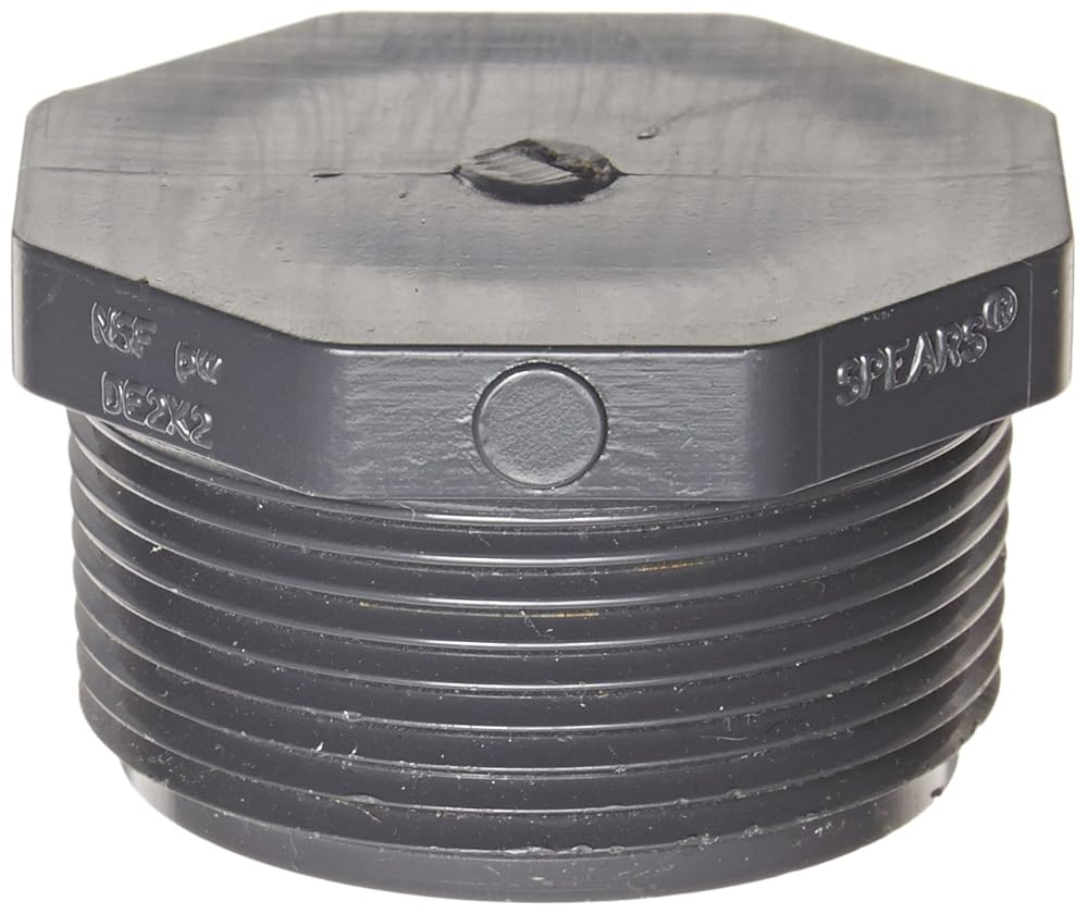 This Spears plug pipe fitting, in gray, is made of schedule 40 PVC and has a male NPT end connection. The plug inserts into a pipe or fitting to terminate its end. It has a male National Pipe Taper (NPT) end connection for fitting into a female threaded pipe. The NPT threads create a tighter seal than straight threads. This schedule 40 (standard wall) fitting is made of PVC (polyvinyl chloride) for corrosion resistance, high strength, and less weight than fittings made from metal. It is compatible with schedule 40 PVC pipes and fittings. PVC can be connected to other materials such as steel, copper, or cast iron using transition fittings. This fitting complies with National Sanitation Foundation International (NSF)/American National Standards Institute (ANSI) 61 Annex G, NSF/ANSI 372, and conforms with lead content requirements for “lead free” plumbing as defined by California, Vermont, Maryland, and Louisiana state laws and the U.S. Safe Drinking Water Act due to take effect January 2014. This plug pipe fitting is suitable for use in cold-water pressure distribution systems including irrigation, pool and spa, potable water, and chilled water applications.