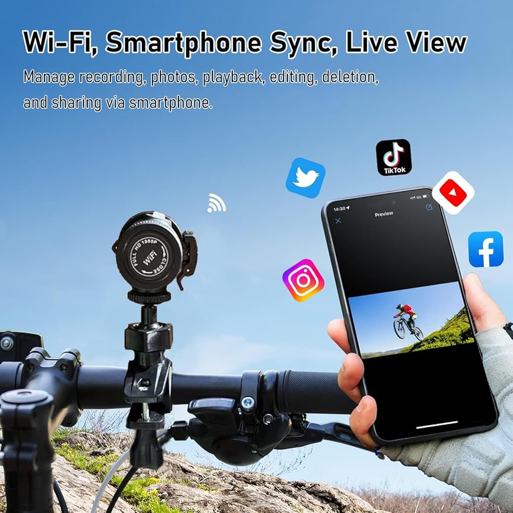 WiFi Helmet Camera: The sports camera enables interconnection with phones via WiFi. Download the free app and connect to preview, playback and download content in real time, without using traffic data. This makes it convenient for sharing and using the camera during activities.