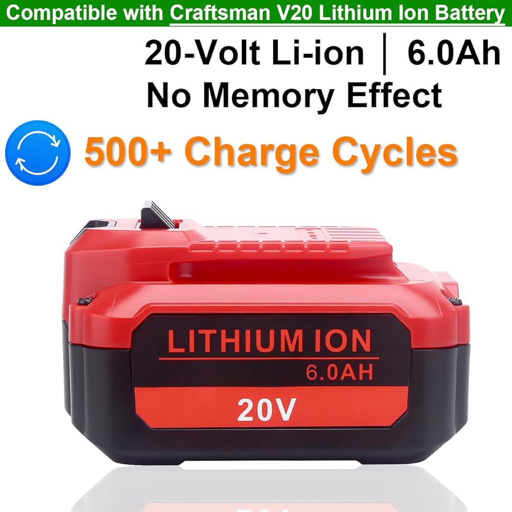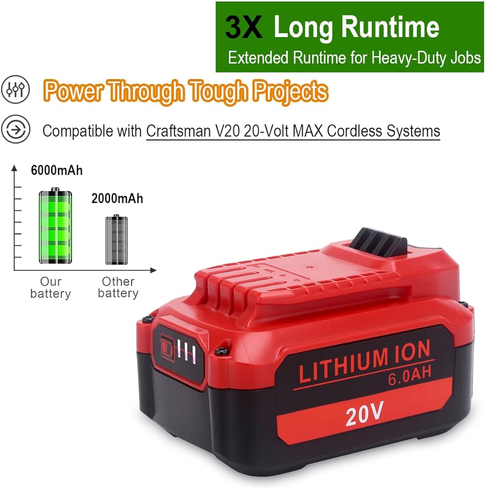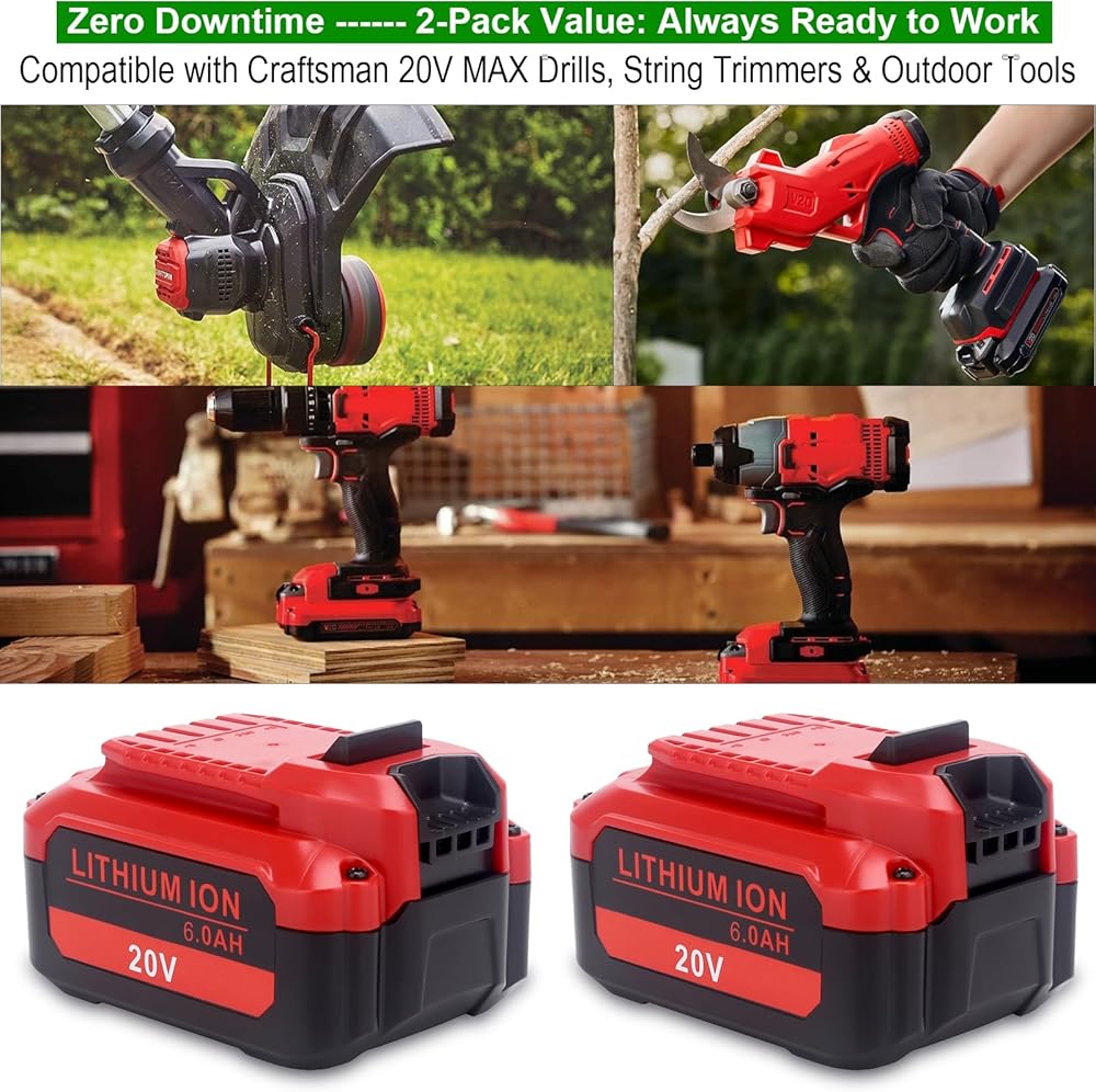 Extended Runtime: 2-Pack compatible with Craftsman V20 lithium-ion replacement batteries (models CMCB202, CMCB204, CMCB206, CMCB209); 6000mAh capacity delivers three times longer runtime than 2.0Ah models; ideal for heavy-duty applications