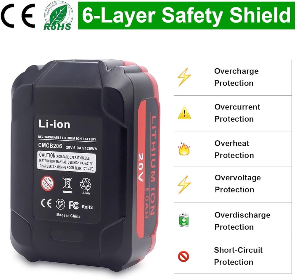 Reliable Power Management: 3 LED indicators monitor battery levels compatible with Craftsman 20V MAX tools; 500+ charge cycles ensure long-term reliability; FCC/CE/RoHS certified with 6-layer protection (overcharge, overcurrent, overheat, overvoltage, overdischarge, short-circuit)