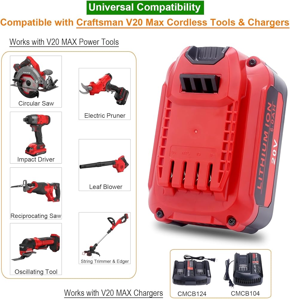 Broad Compatibility: Compatible with all Craftsman 20V MAX cordless drills, impact drivers, saws, chainsaws, oscillating tools, blowers, and outdoor equipment; works with chargers CMCB104 and CMCB124 for seamless power delivery