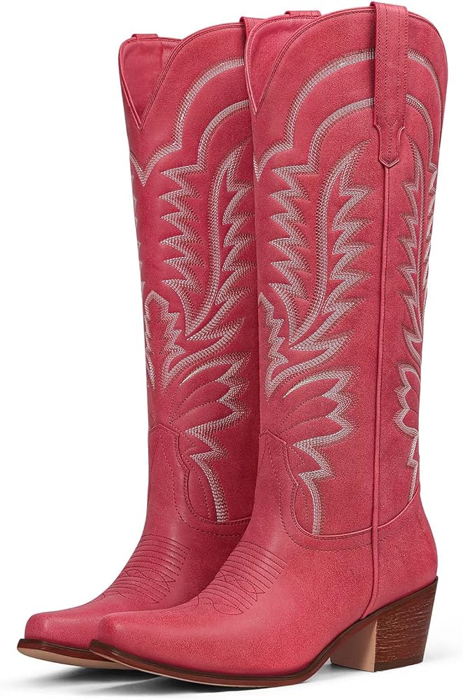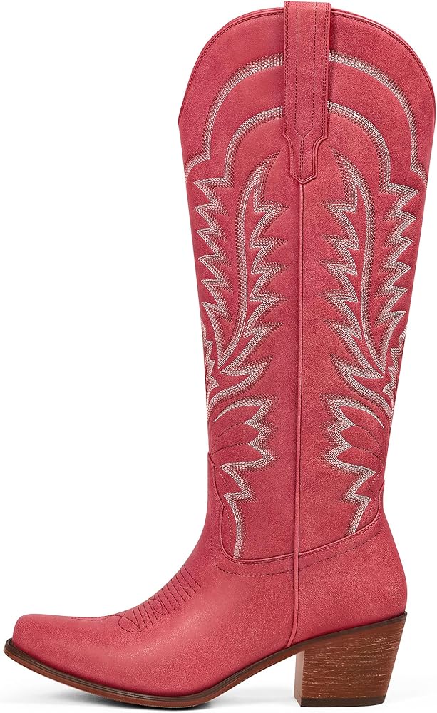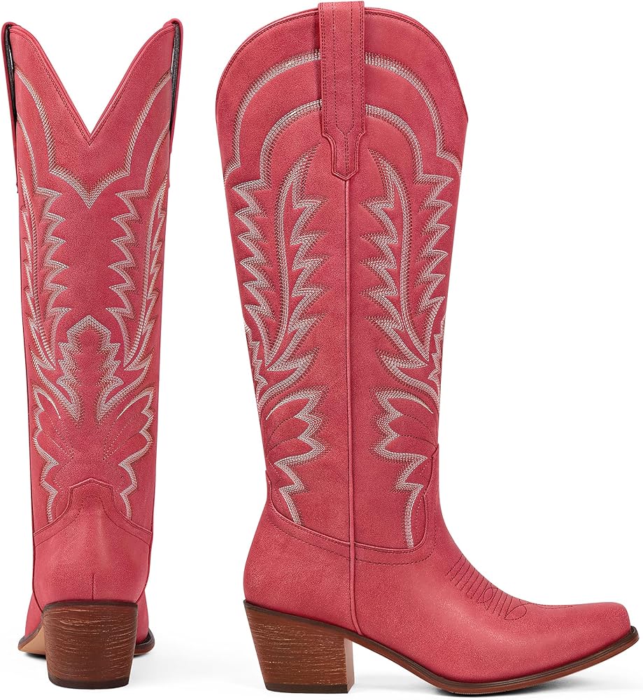【Classic Western Style】 The 17-inch boot shaft height is highlighted by elegant classic lines and a fashionable, avant-garde shape that enhances an upright posture. The boots feature elegant stitching patterns and a pointed thick heel, adding timeless Western charm. The V-shaped cuffs visually slim the legs, boosting the overall sense of fashion.