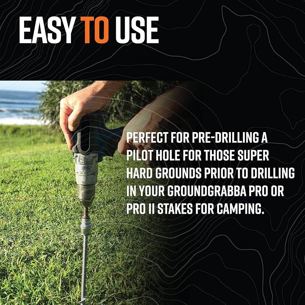 If you go camping on really hard compact ground and you're finding it almost impossible to drive your GroundGrabba Pro, Pro I or Pro II into the ground then try pre-drilling the ground using this 1/2″ x 24″ masonry drill bit. You may need to drill the ground an inch or two at a time and keep clearing the hole if the ground is ‘that' hard. Perhaps you may also need to widen the hole too.