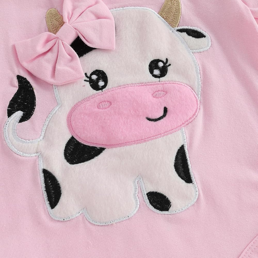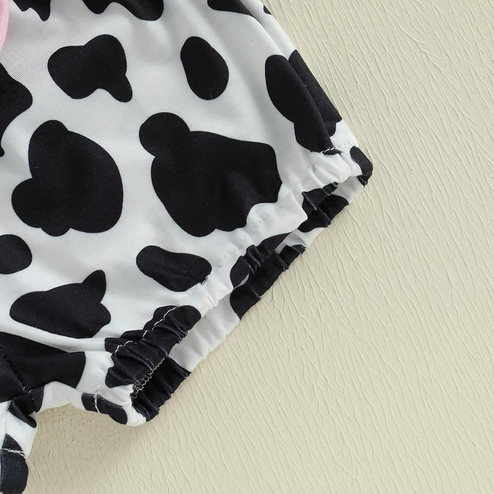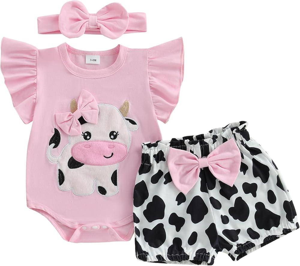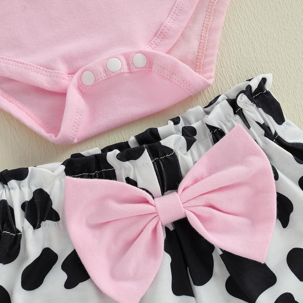 Baby Girls Shorts Set, Short Sleeve Bear/Cow Romper Elastic Waist Shorts with Hairband Summer Outfit