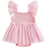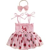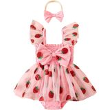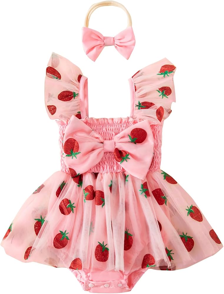 - Feature: baby girl strawberry outfit, baby girls summer romper dress, strawberry embroidery tulle romper with headband, newborn romper; sleeveless, square neck, bow front, tulle skirt hem, elastic leg openings; bottom snap closure, easy to change diapers
