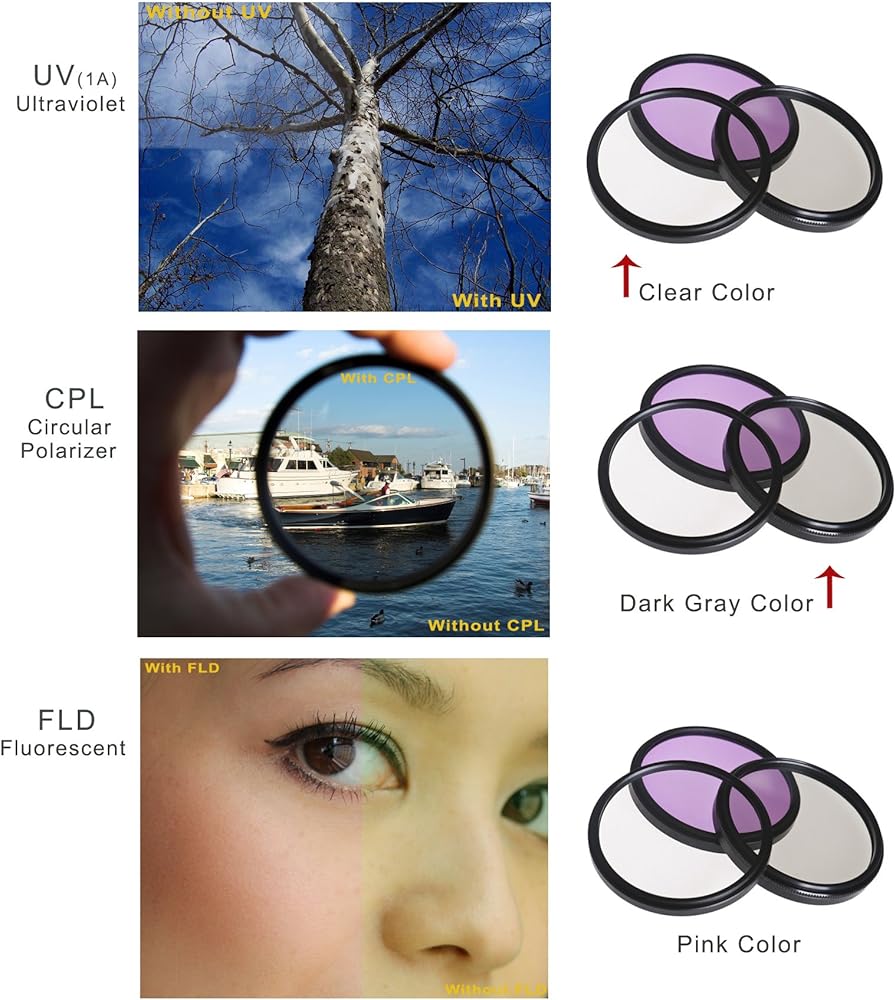 This Item Includes: 1. UV Lens Filter 2. Circular Polarizing Filter 3. Flourescent Filter 4. Filter Pouch 5. Nwv Direct Microfiber Cleaning Cloth. These multi-threaded filters may be used in a stacking formation. The lens these filters are designed for are to be mounted on TOP of the filter(s), as these lenses do not have top threading. The effects of the filters will be displayed in the image while using it through the lens. Lens filters are translucent pieces of glass placed in front of a camera lens to alter or adjust the light entering the camera and more importantly to protect the camera lens. Lens filters improve photographs by giving photographers control over light and allowing them to emphasize the features of a scene that they consider most important.This filter kit is a combination of the three essential filters no photographer should be without. UV--Film and a digital CCD are more sensitive to UV light than our eyes are. This often shows up in images shot from high altitudes and long distances especially over water. This filter will remove the UV light and more importantly protect your lens from moisture, scratches, and damage. Circular Polarizer--provides color and contrast enhancement. Reflected light often shows up as a whitish glare that washes out color in an image. A polarizing filter will correct this problem creating deep blue skies. It also removes glare from non-metallic surfaces such as windows and water.FLD--provides color correction when shooting under fluorescent lighting. It will remove the greenish tint from the image, providing pleasing skin tones and true to life color renditions. Warranty:10 year manufacturer warranty. Made in Japan