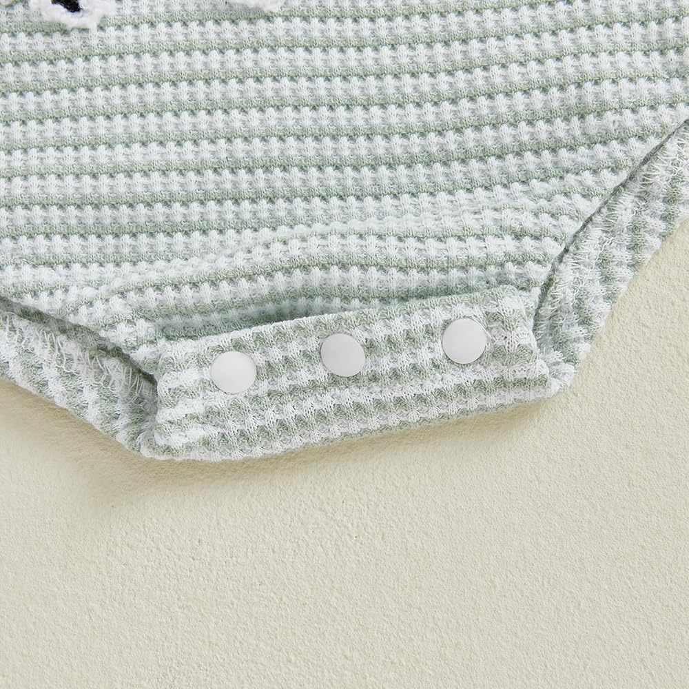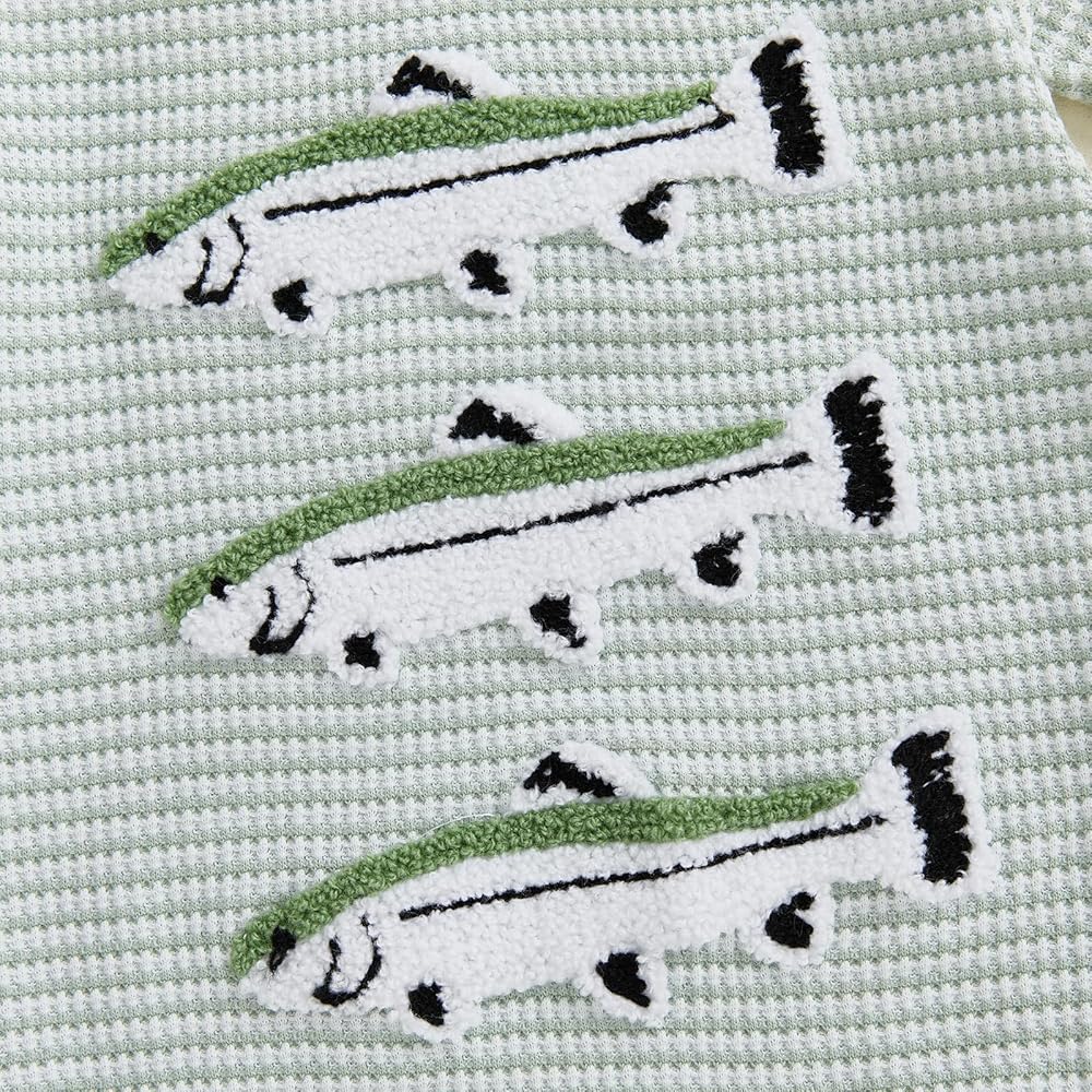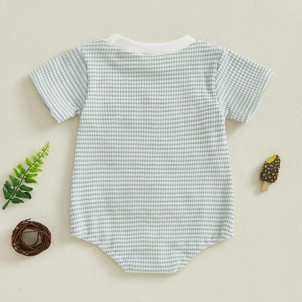 Baby Summer Waffled Romper Stripe Fish Embroidery Short Sleeve Round Neck Jumpsuit
