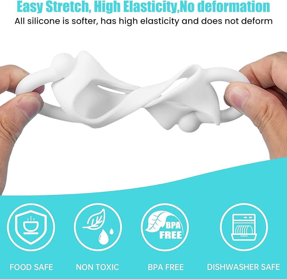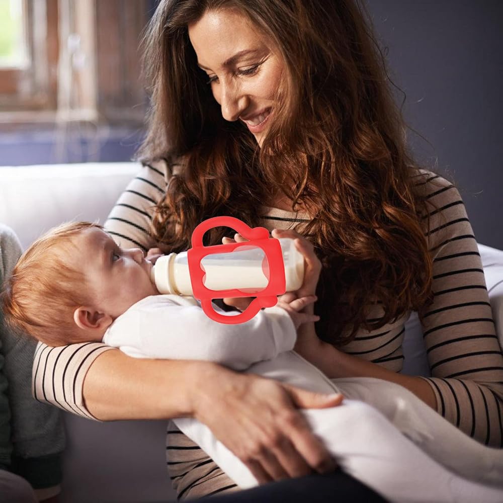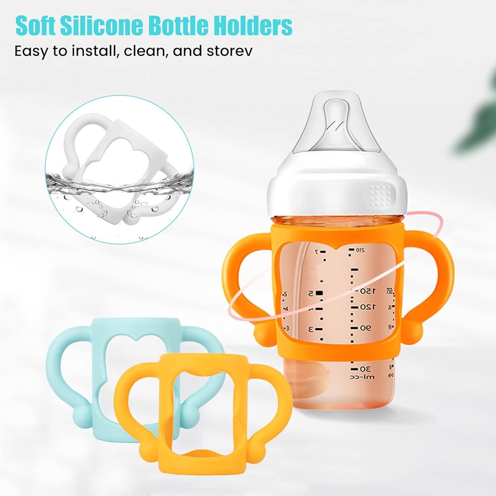 Food-Safe Soft Silicone: Baby Bottle Handles bottle holder for baby self feeding is made of food grade silicone, BPA free, no chemical additives. Soft silicone is safe, especially for teething babies. silicone handles are easy to wash, dishwasher and sterilizer safe.