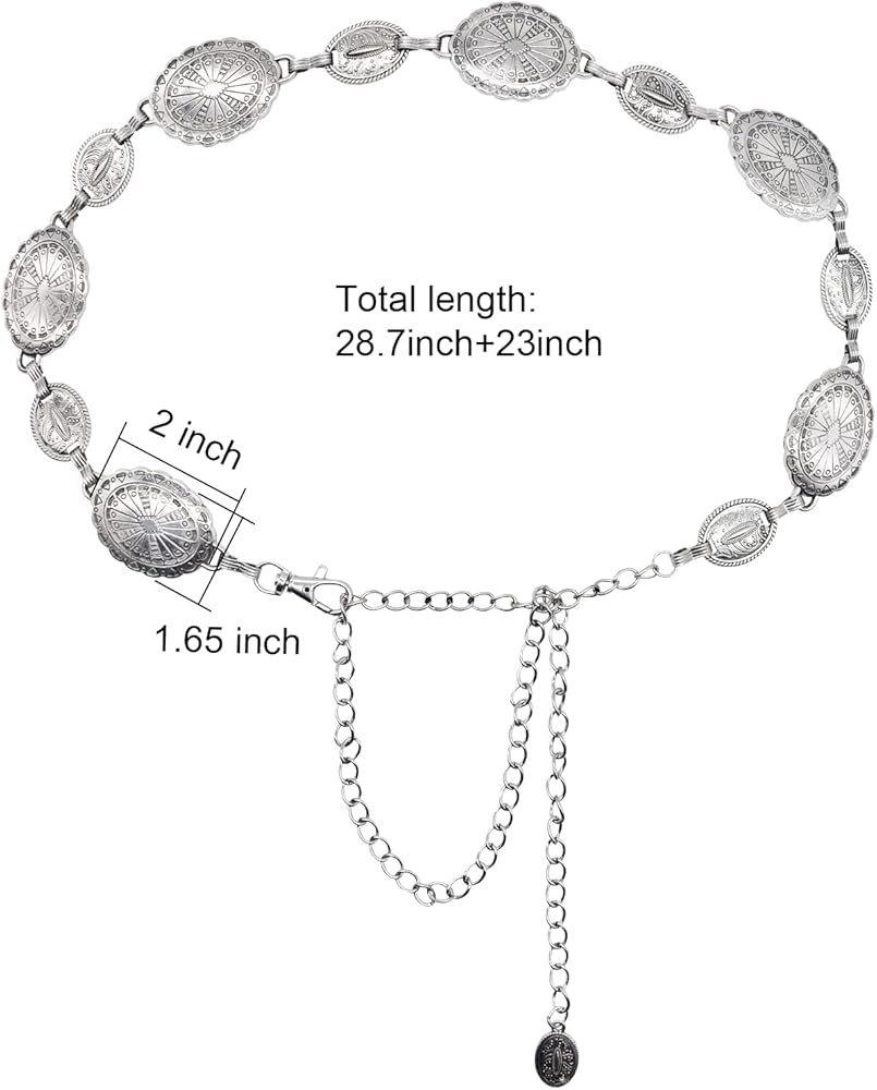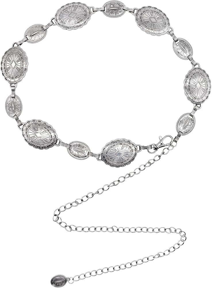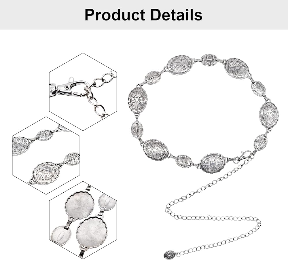 Fashionable Design: Our western waist chain belt is made of high-quality metal alloy with a lobster clasp that is easy to secure and remove. The silver metal finish is long-lasting and durable, ensuring it won't easily get damaged over time.