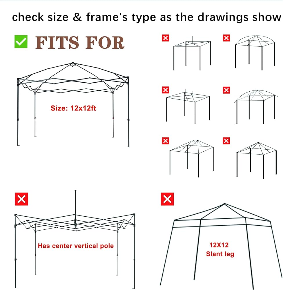 ✅【Note】10x10ft replacement top fits for most of the without peak pole straight legs frame. Measures 10' W x 10' D x 37" H. "Not for any canopy with slant leg "