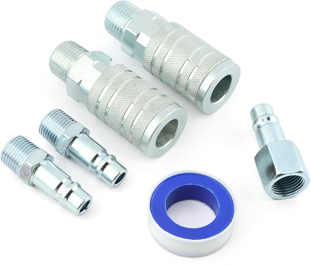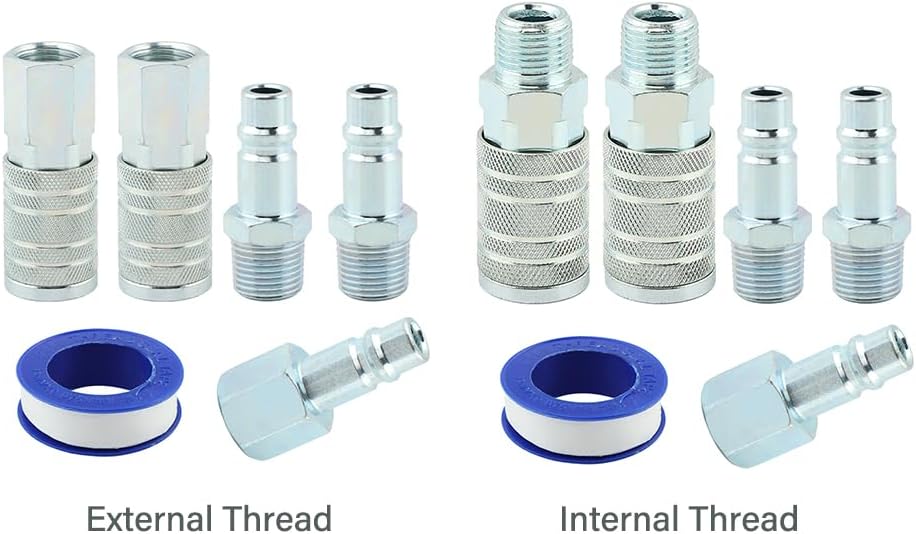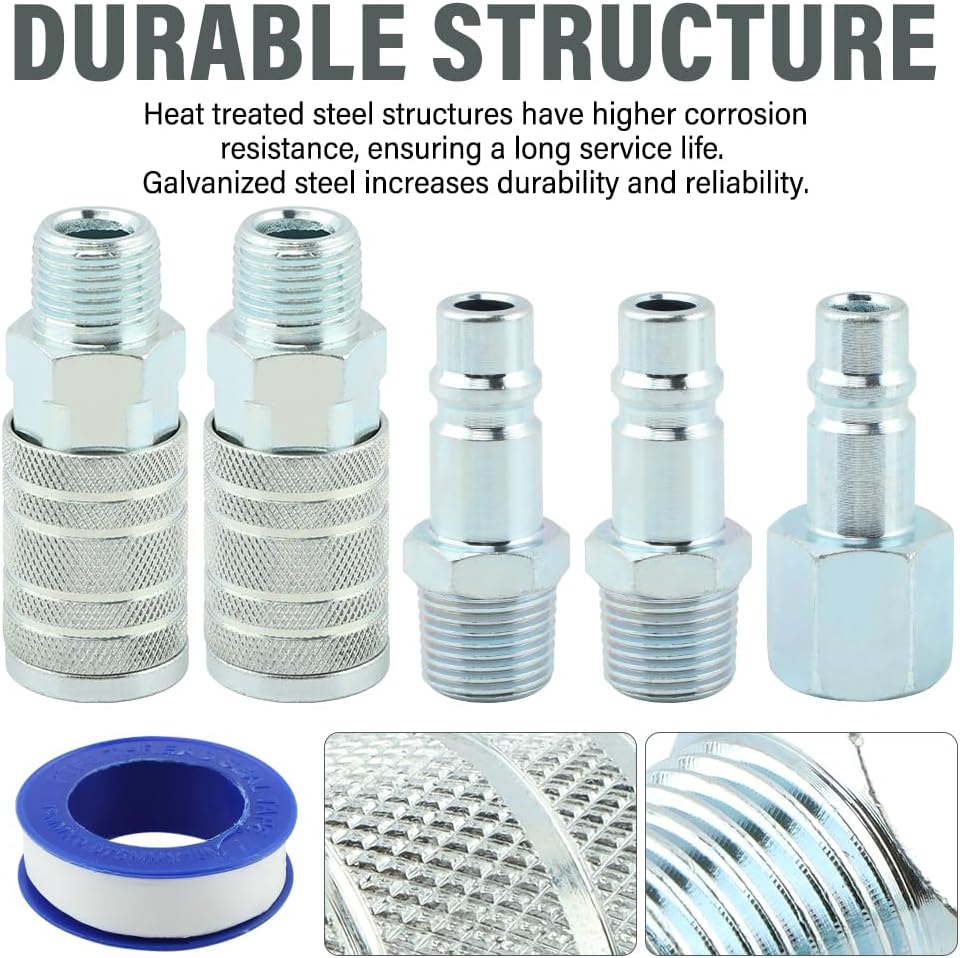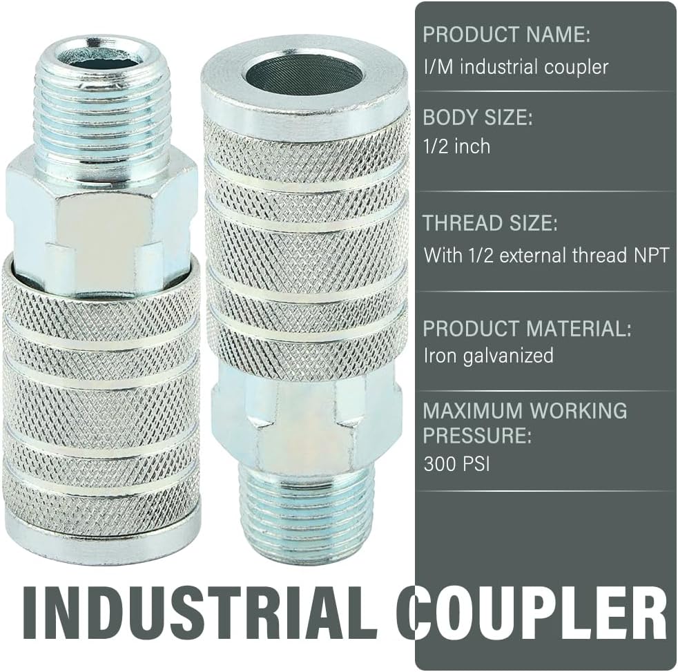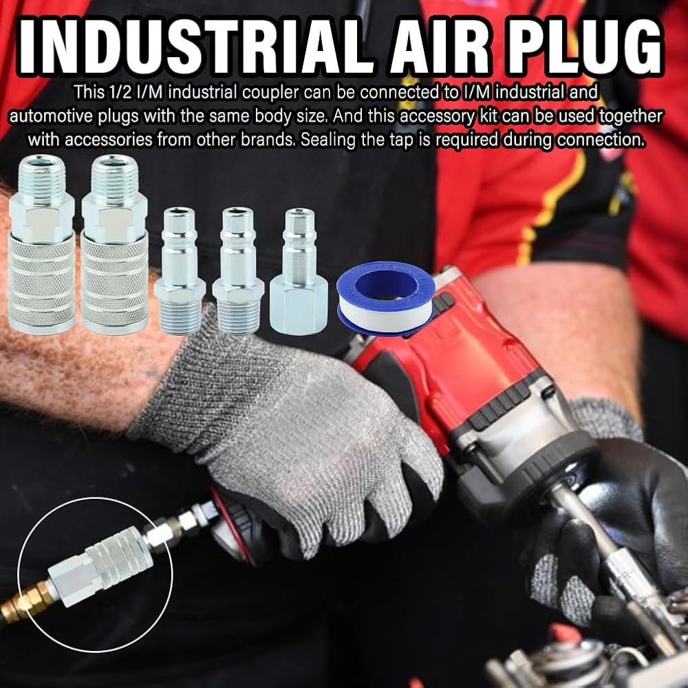 【Package Included】The kit includes 2 1/2-inch I/M industrial air couplers with 1/2 male NPT, 1 1/2-inch I/M industrial air plug with 1/2 female NPT, 2 I/M industrial air plugs with 1/2 male NPT, 1 roll of tape.