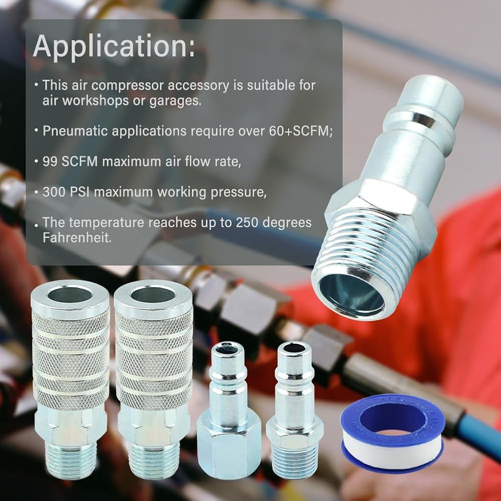 3. Applications: These air compressor fittings are suitable for air workshops or garages. Pneumatic applications require more than 60+ SCFM; maximum air flo/w of 99 SCFM, maximum working pressure of 300 PSI. Temperature up to 250 degrees Fahrenheit.