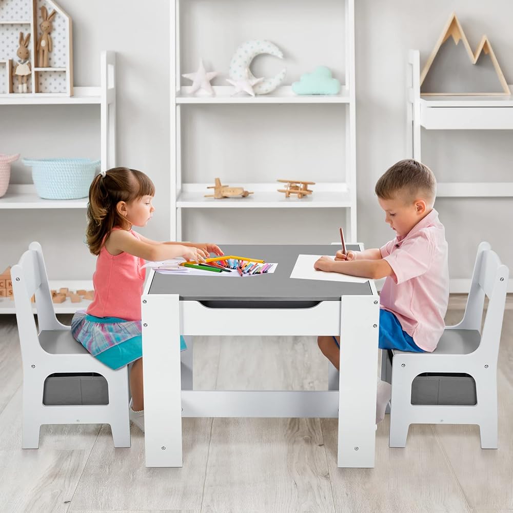 3 IN 1 TABLE & CHAIRS SET: On side of tabletop is blackboard for drawing and writing with chalk. Kids can create freely and erase easily. The other side is for reading, playing and eating. After removing the desktop, children can play with toys, build blocks, or make crafts with friends. 3 in 1 activity table is perfect for reading, playing, drawing and learning.