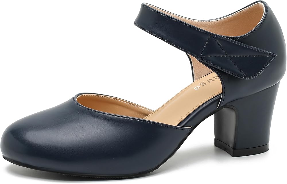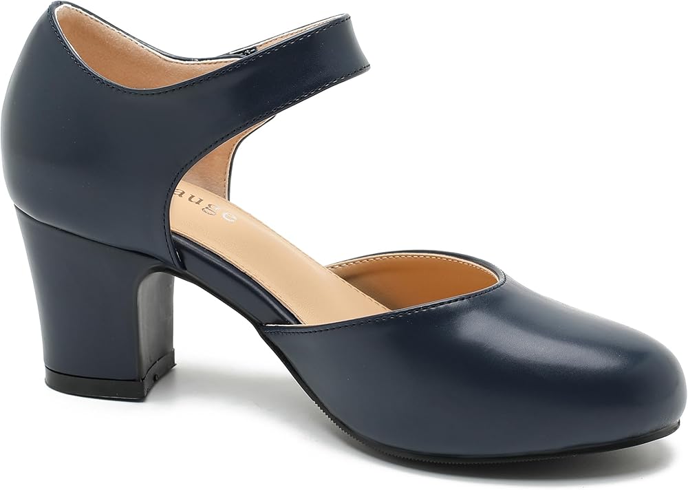LOW HEELS FOR WOMEN: These chic wide width dress shoes for women feature a rounded closed toe, beige shoes, block heel, D'orsay, vintage ankle strap, and Hook Loop design.Various classic solid colors are available.