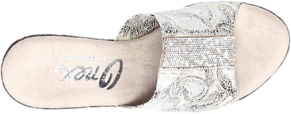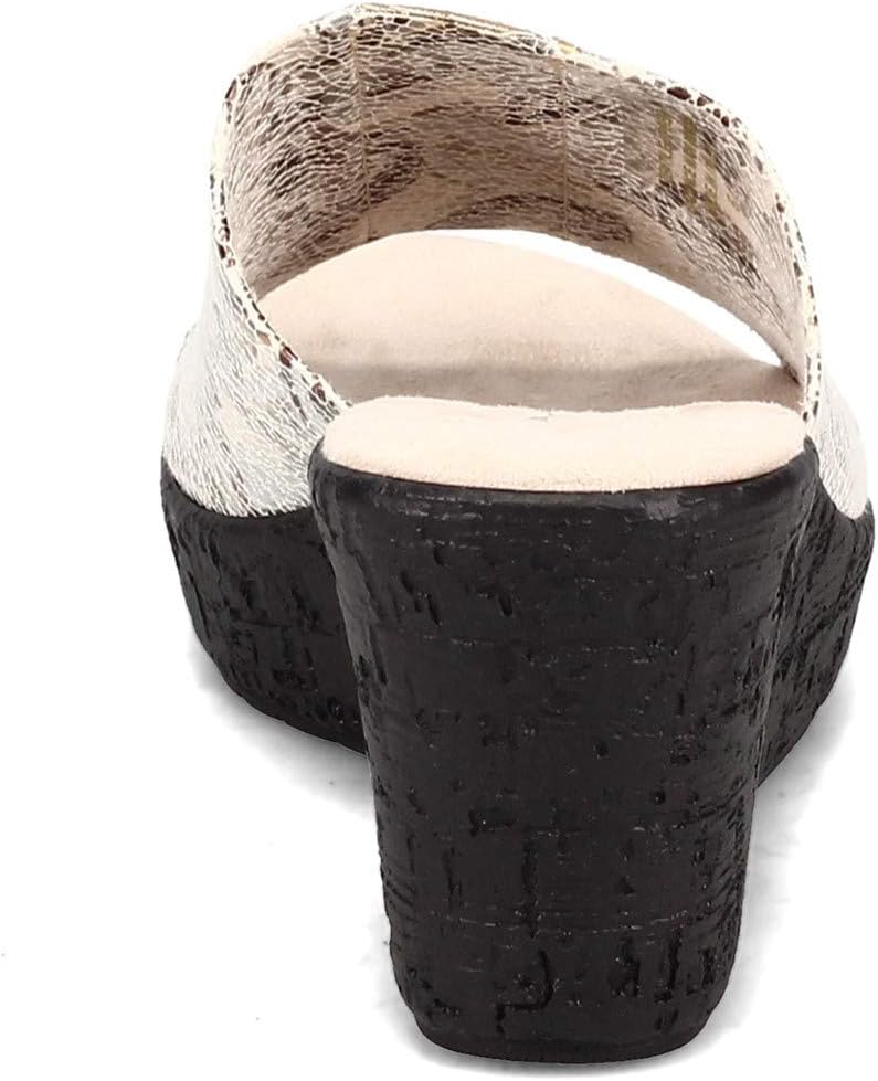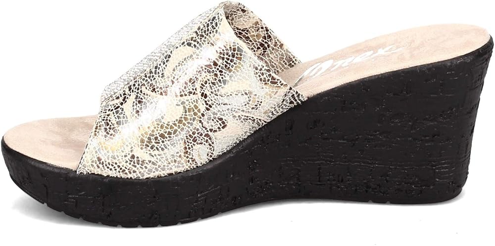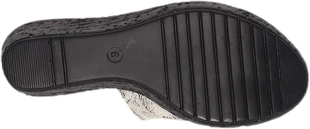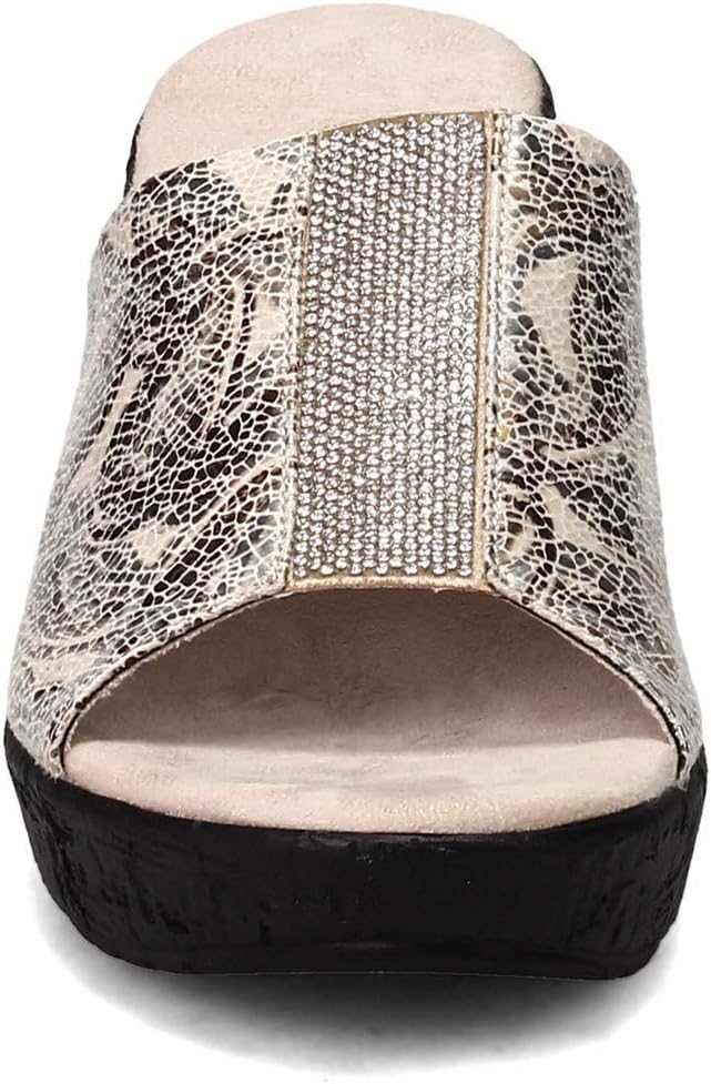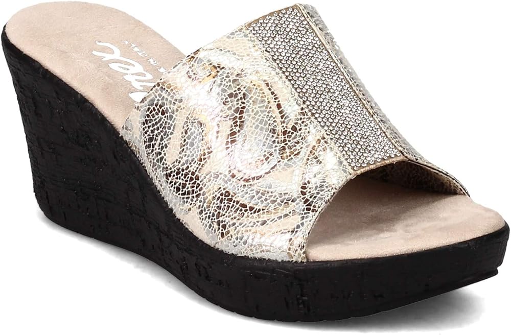 Take your look to the next level in these dazzling wedge heel slides! You'll love the pretty mini rhinestone accents for subtle sparkle that's perfect for dress or casual wear. Super comfortable slide with soft printed fabric uppersPretty mini rhinestone accents add just the right amount of sparklePlush sueded cushion footbedWedge heel with low platform for added heightManmade outsole