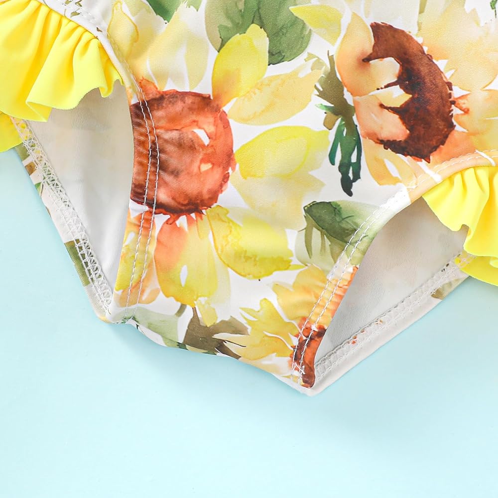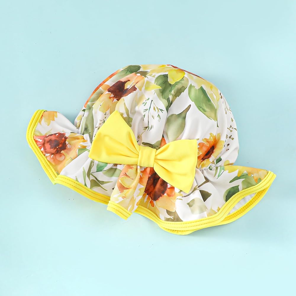 ❤ Baby girls swimwear design: Baby girl bikini set tops is solid color sleeveless ruffle Strap style design, Matching mermaid and flower pattern ruffle design bottom bikini, and a cute hat, There are a variety of prints to choose from. It's very lovely 3 piece set swimsuit, Put on make you baby more attractive and unique. The combination of fashion and comfort, The matching of the hat can bring the baby a good sun protection effect.