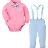 The 2 piece baby boys gentleman outfit is designed with long sleeve dress shirt, elastic waist pants, detachable bow tie and stretch suspender. Snap closures at bottom make it easy for you to change diapers. Buttons at front and cuffs for dressing easily.
