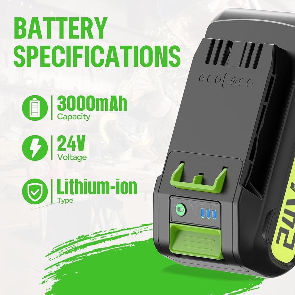 【Upgraded】: Type: Lithium-ion | Voltage: 24V | Capacity: 3000mAh | Watt: 72Wh (Offers 1.5X more power than For Greenworks 24V 2.0Ah battery). Lithium-ion battery for Greenworks 24V batteries delivers fade-free power with no memory loss after charging.