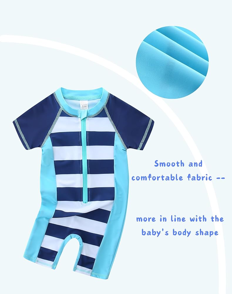 【Design Features】The front zipper design makes this baby boy bathing suit easy to put on, take off, and change diapers. The slim fit and elastic fabric make the swimsuit romper perfectly fit the baby's body shape. And the collar features a small design with zipper protection, which can prevent the baby's delicate skin from being scratched. At the same time, the fabric treated with chlorine resistance makes this swimsuit more durable and long-lasting.