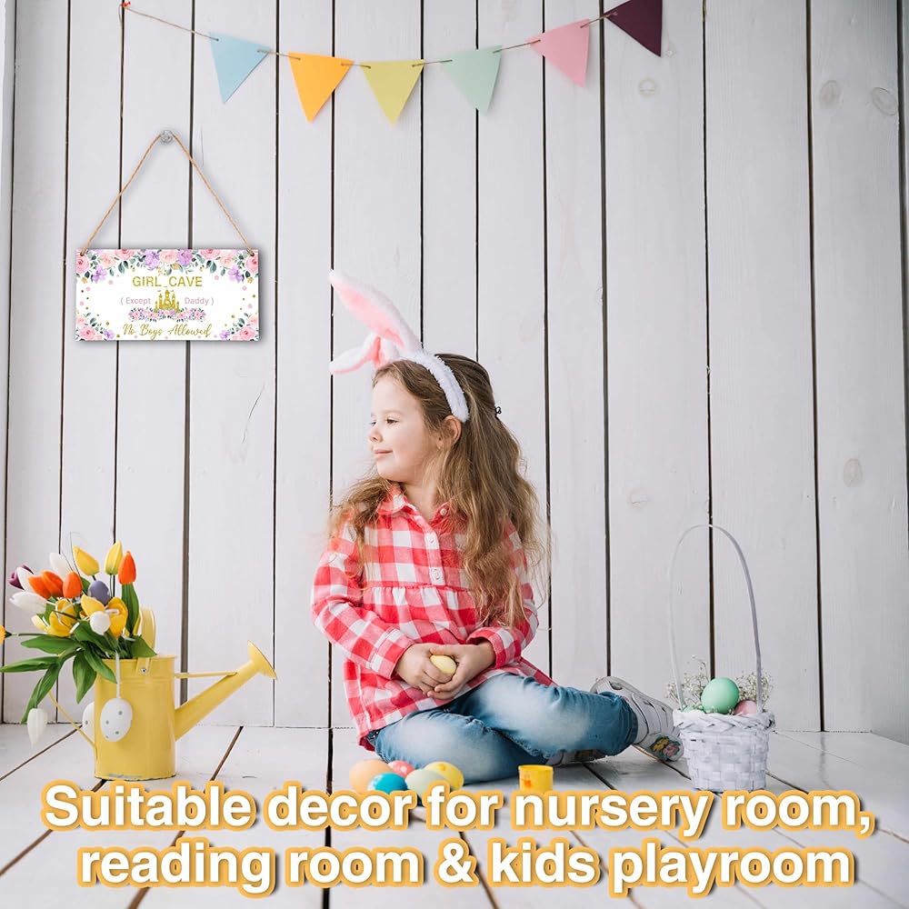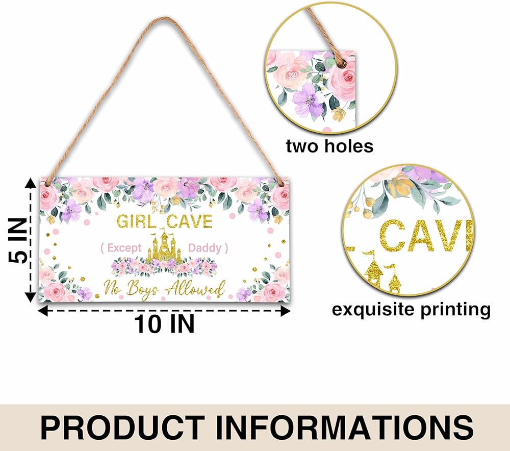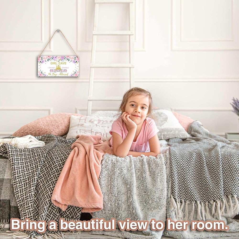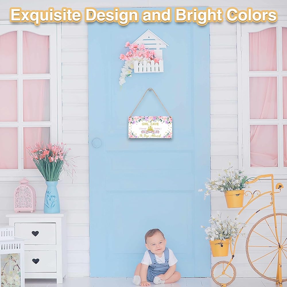 『What You Will Get』: 1 wooden hanging plaques with one sturdy rope for hanging the wooden sign. 『Size』: The front door sign is approx 5 x 10 inches. The rope is 19.7 inches. (Manual measurement, please allow slight errors on size.) 『Reliable Materials』: This wooden wall art is made of quality wood material, which is not easy to bend or crease, it's sturdy and durable. The wooden hanging plaque and rope will serve you well and provide you with a great experience. 『Wide Application』: This can be used as a "girls only" sign, a "sisters' room" sign, a "no boys allowed" sign, room decor for girls, wall decor for teen girls' rooms, items for girls' rooms, or to add a cute and princess-like touch to any space. 『A Creative Decor Gift』: With its exquisite design and vibrant colors, this wooden sign makes a fantastic addition to the door or wall of your nursery, kids' bedroom, or playroom. It's an excellent choice as a gift for baby showers, girls' birthdays, newborns, and more.
