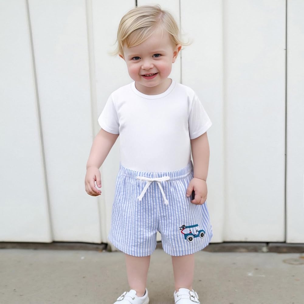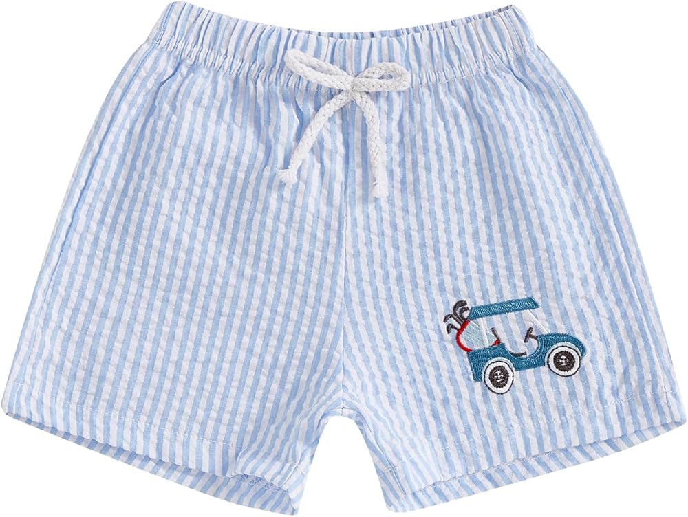 Toddler Boy Girl Seersucker Shorts Golf Cart/Tractor/Baseball/Football Embroidery Elastic Waist Shorts Infant Striped Linen Shorts
