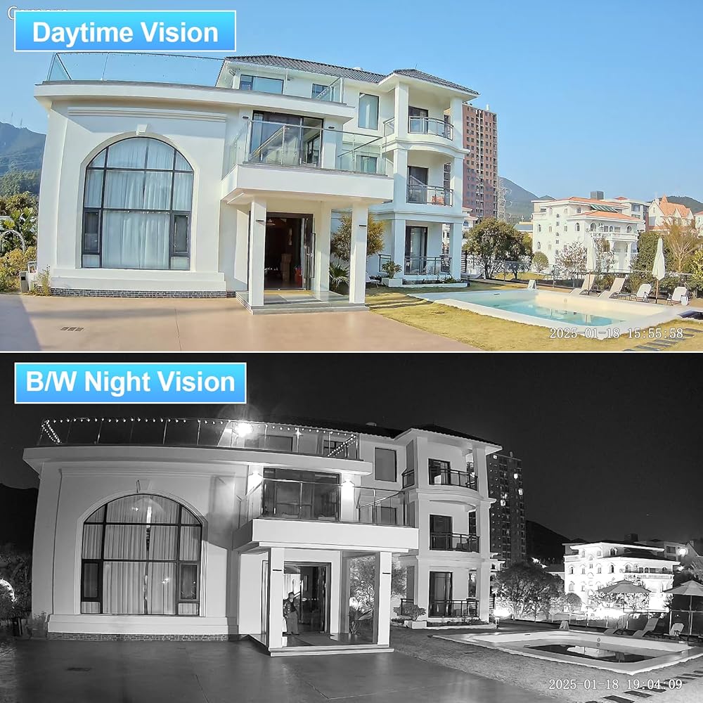 NIGHT VISION: The camera automatically switches to infrared night vision mode in low light or complete darkness, with an infrared range of up to 120 feet, providing clear black-and-white surveillance images.