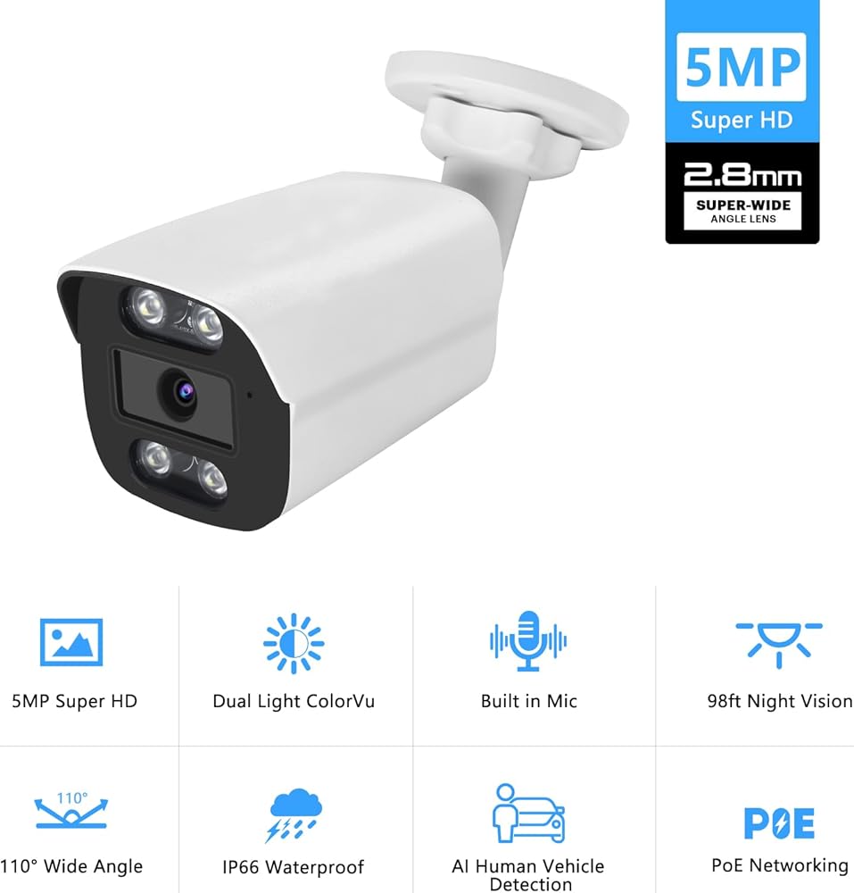 5MP PoE IP Color Night Vision Camera, Smart Dual Light Bullet Security IP Camera, Built-in Mic, 98ft Night Vision, 110°Wide Angle, Human Vehicle Detection