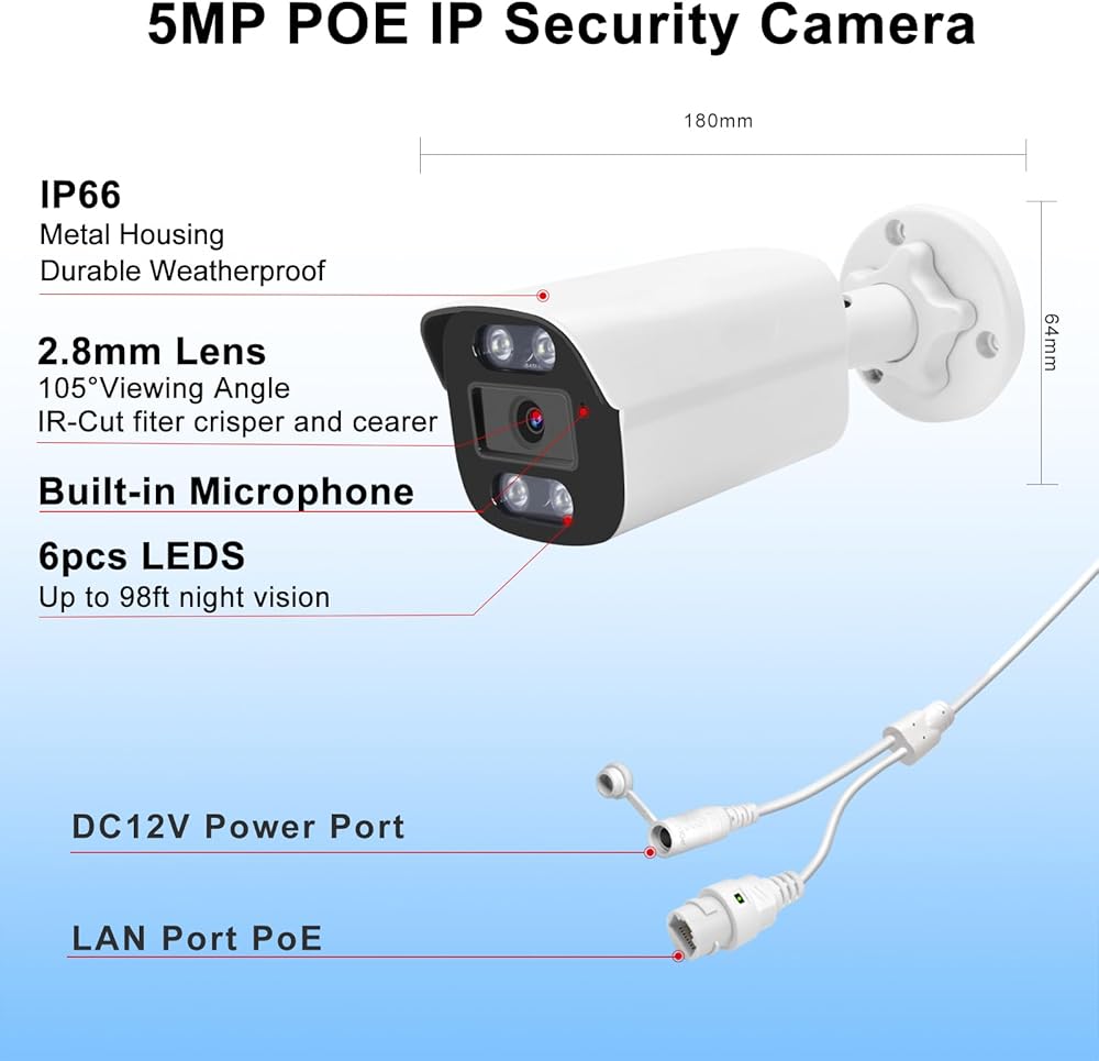 【5MP Super HD+2.8mm Lens+PoE】This is a 5mp professional security camera. 5Megapixel (2592 x 1944) Super-high-definition provides you a more clear image than 4MP/3MP/1080P Full HD Cameras. With PoE (Power over Ethernet,uses a single Ethernet cable to transmit both data and power) function, no need power adapter( PoE switch/PoE Injector required, not included).