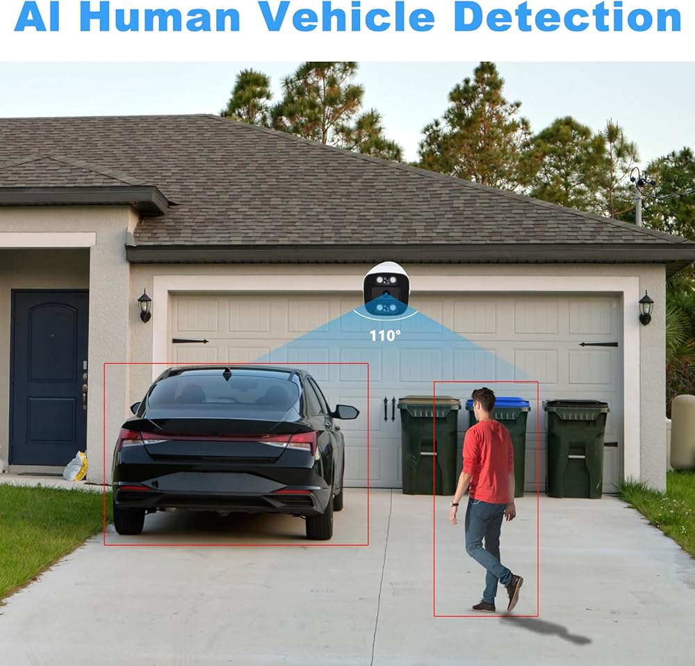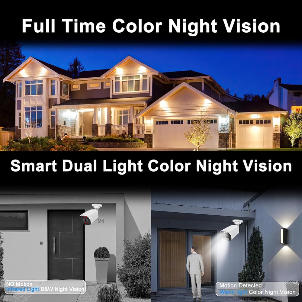 【Smart Dual Light Color Night Vision】The 5mp security ip camera features smart color night vision, when the camera detects person or vehicle, the dual lights will open and the video turns to color mode, letting you know more details, and you can also change the night vision mode to IR night vision or 24H color night vision mode(Full Color Mode) if you need.