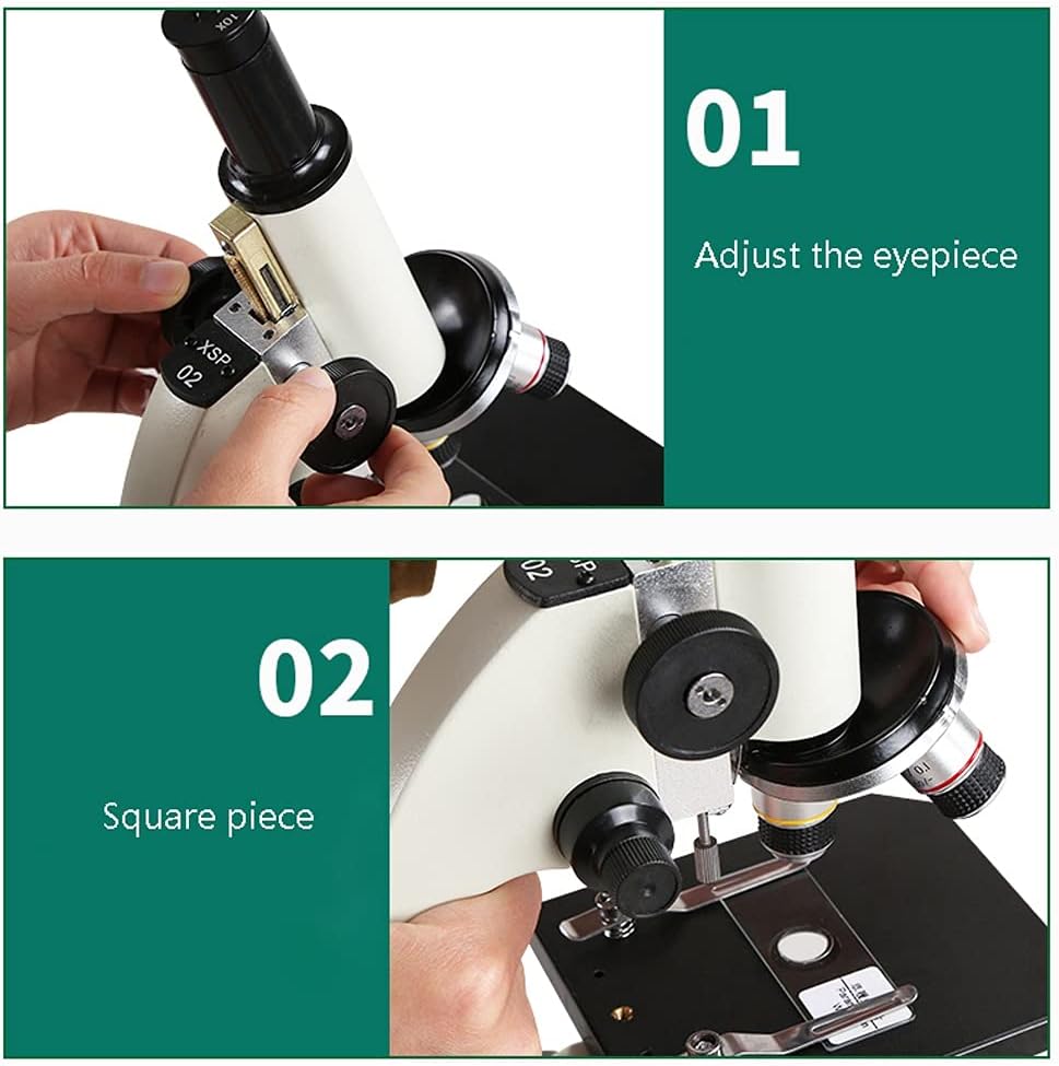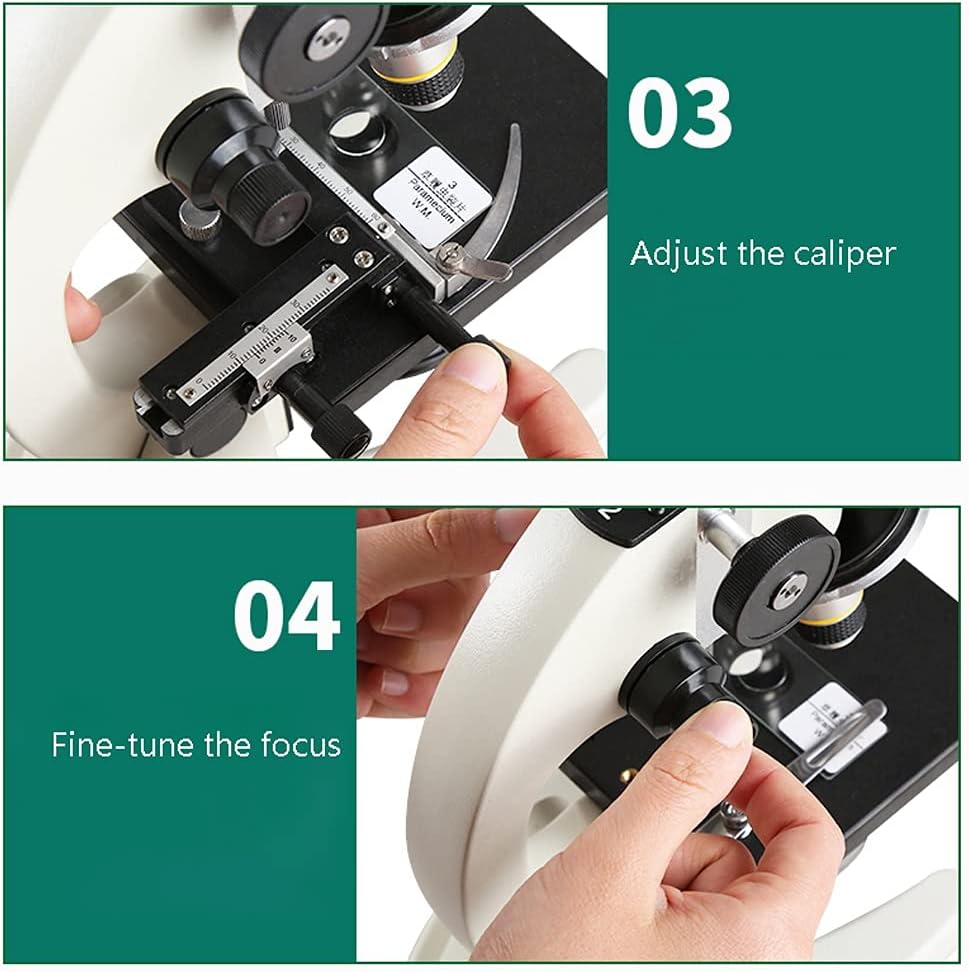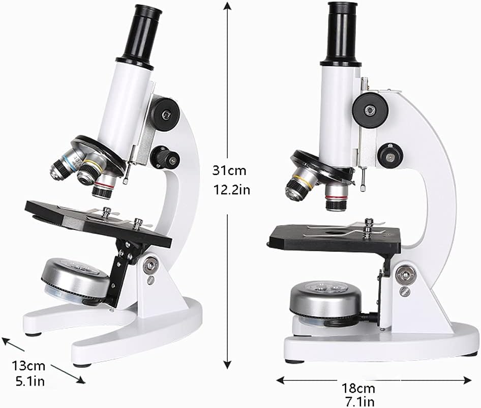 The material of this microscope is made of metal + plastic. Its dimensions are: 13cmx18cmx31cm/5.1inx7.1inx12.2in.