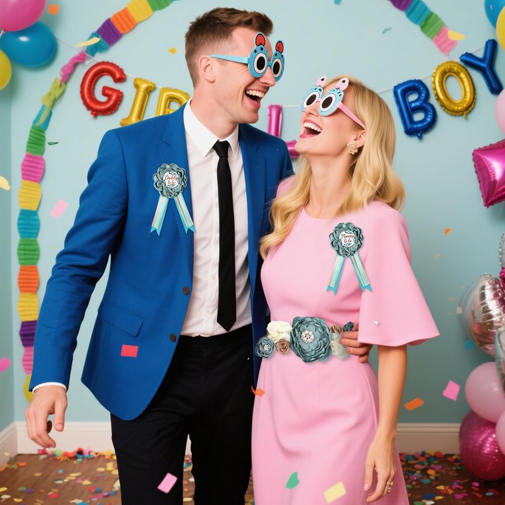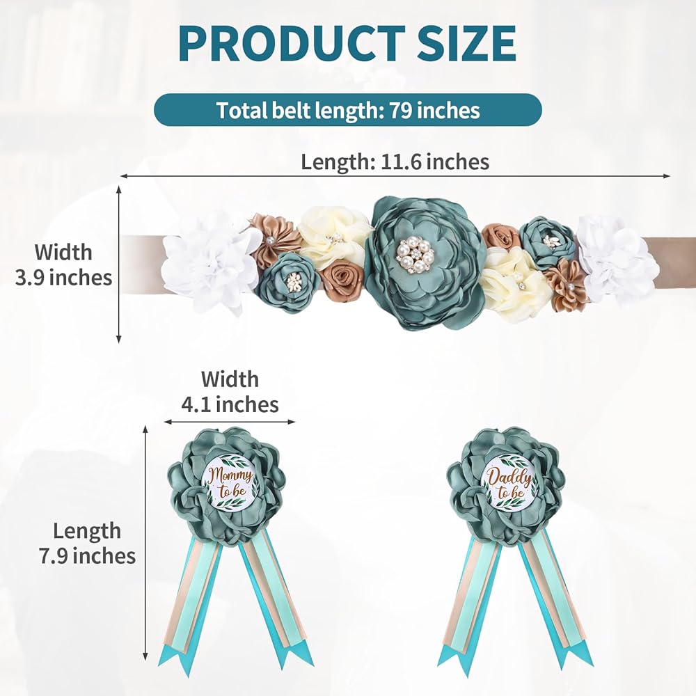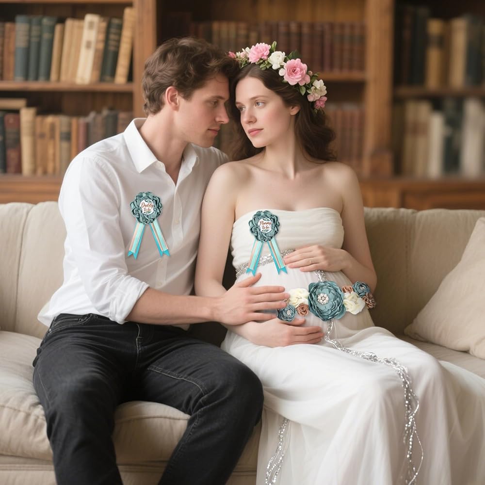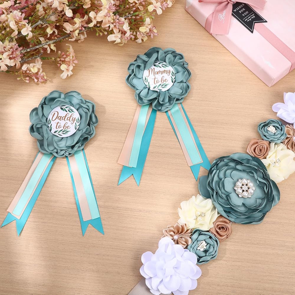 Product includes: mom to be sash*1, mom to be pin*1, dad to be pin*1