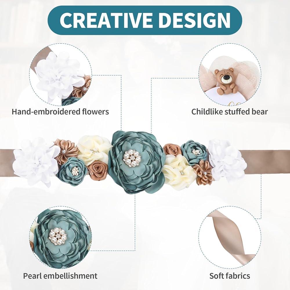 Our baby shower sash for mommy uses light blue hydrangea embroidery with vintage teddy bear elements, inlaid with gorgeous crystals, and XX color satin base to ensure color consistency under indoor and outdoor lighting, making it easy to take pregnancy photos