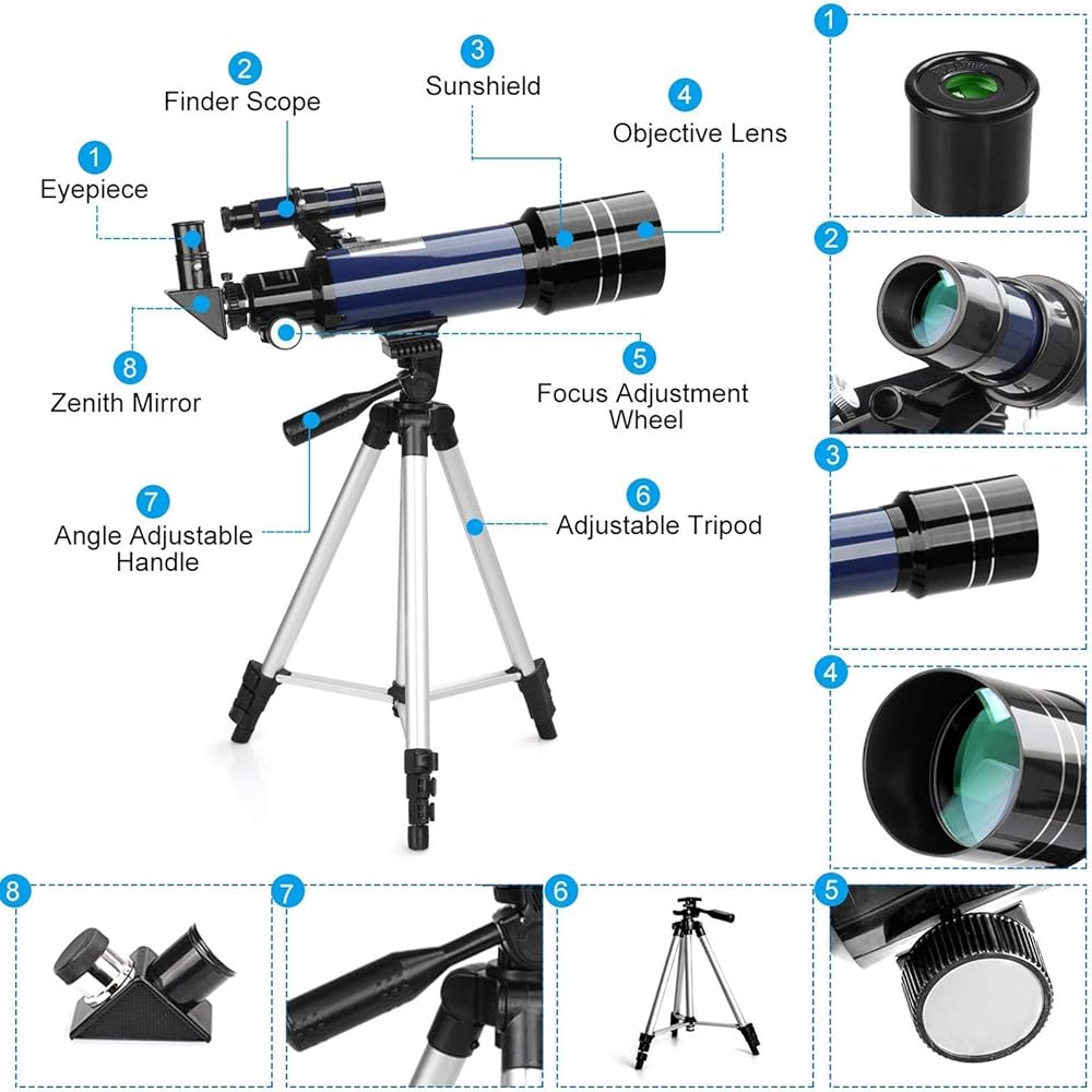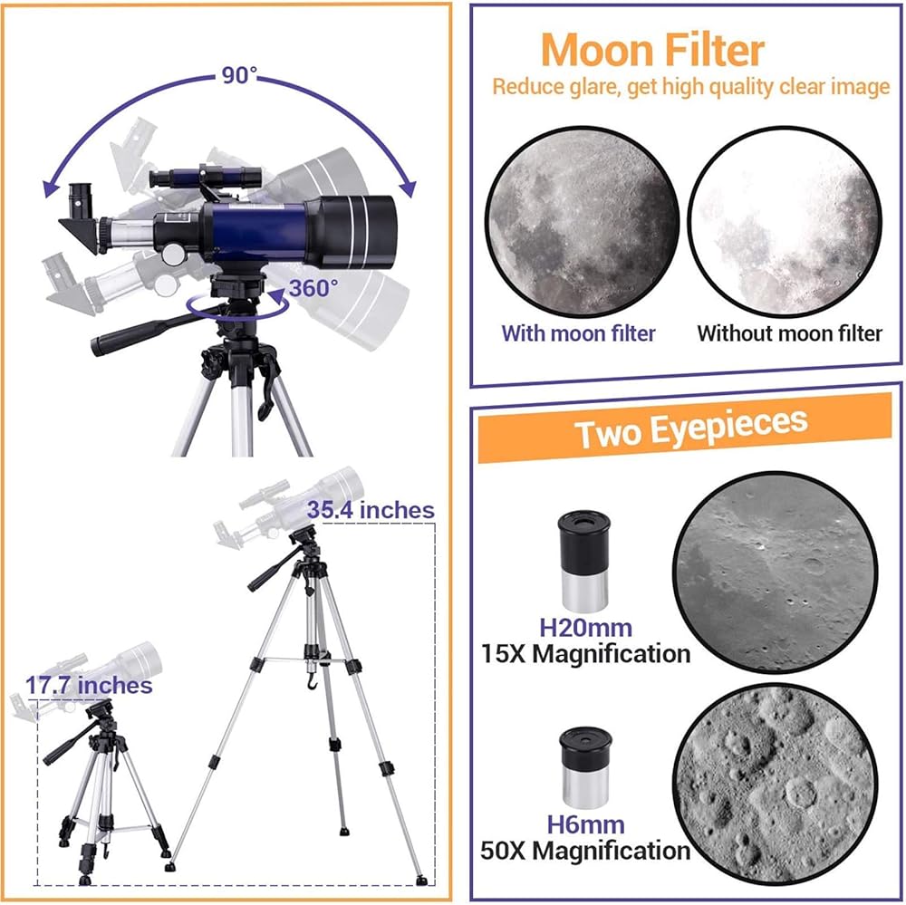 70mm Aperture :The astronomy telescope features premium BAK4 prism system, 400mm focal length, large view. Fully multi-coated lens, high transmission, enhance image brightness and clarity, perfect for observing aurora, moon, planets, meteor, scenery, bird<br