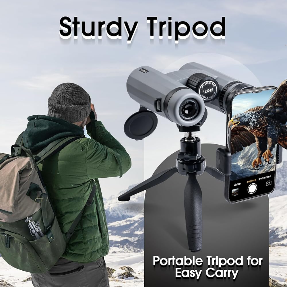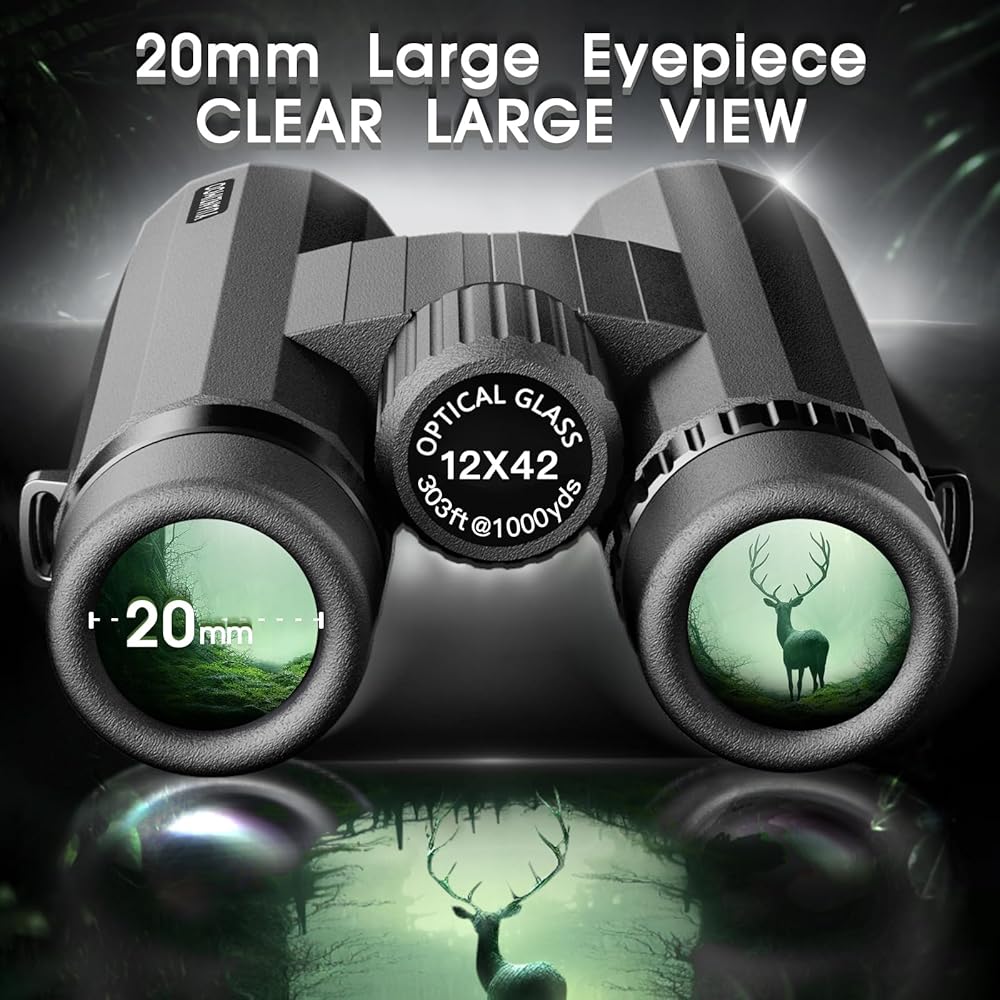 12x Magnification High-powered Binoculars: The 12x binoculars for adults high-powered with 42mm objective lens provides wide field of view, 383ft/1000yds, high definition without blurred image. You can easily get a clear and large vision from more than 650 feet away