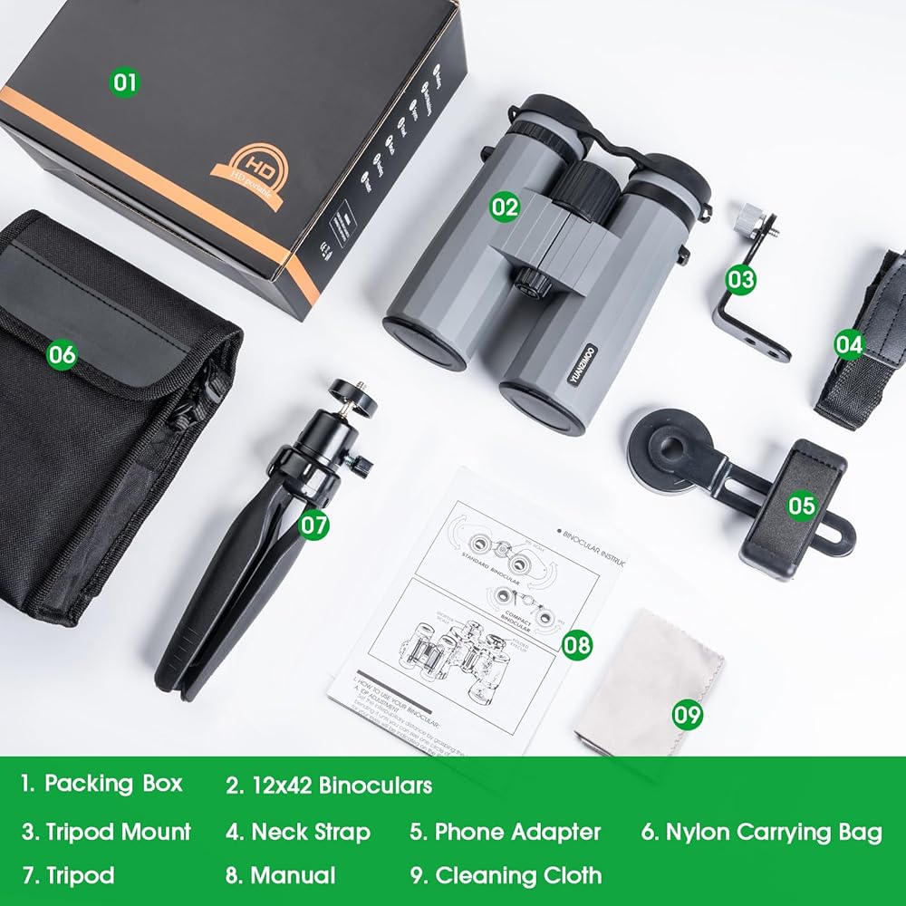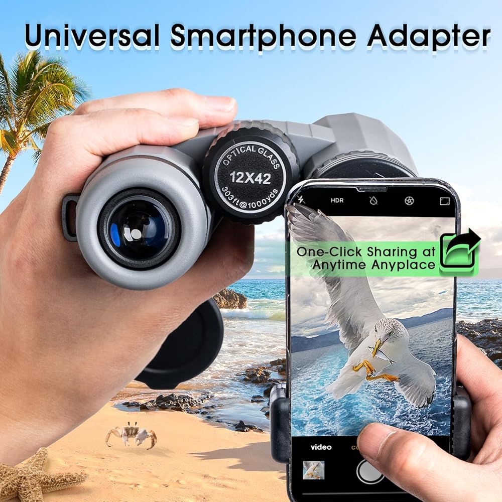 12x42 Binoculars for Adults High Powered Binoculars Waterproof Compact Binoculars with Low Light Night Vision for Hunting Outdoor Sports Concerts Bird Watching Grey